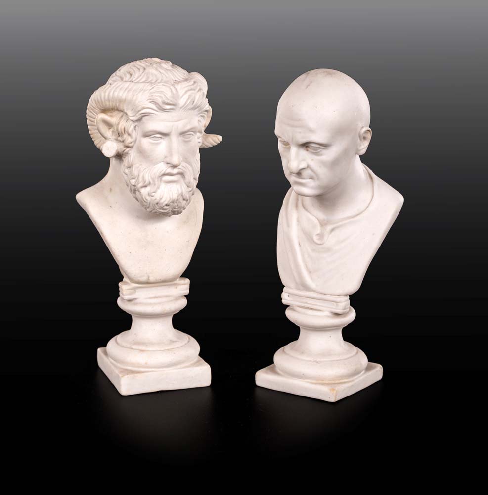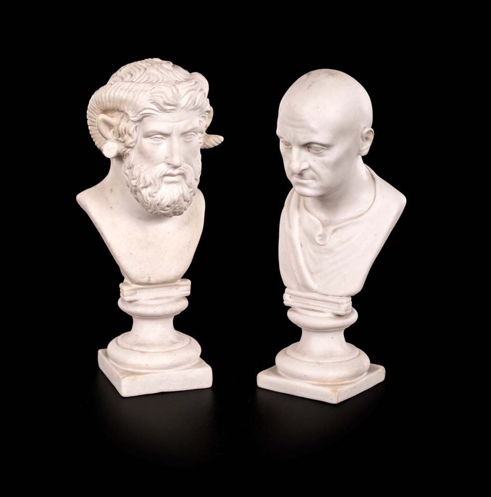Filippo Tagliolini (Fogliano 1745 - Napoli 1809) Due bustini in biscuit, Real Fabbrica Ferdinandea, Napoli, fine del XVIII/inizio del XIX secolo raffiguranti Zeus Ammone e Scipione su piedistalli a rocchetto.