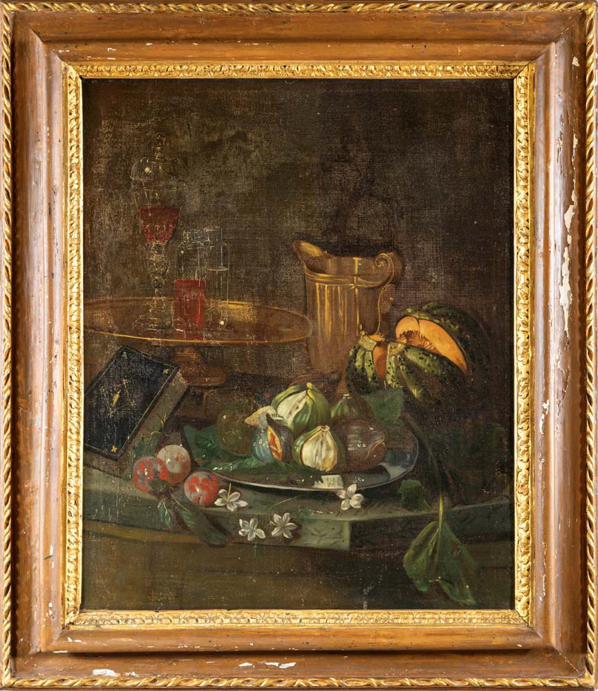 Cristoforo Munari (attribuito a) (Reggio Emilia 1667 - Pisa 1720) Natura morta con libro, fichi e melone olio su tela cm 86x71 - con cornice cm 111,5x97