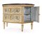 Cassettone a demi-lune in legno laccato, Piemonte, fine del XVIII secolo rifinito da piano in marmo nero (non pertinente), reca due cassetti frontali e due ante angolari con pannelli azzurri arricchiti da rilievi decorativi dorati; al centro mascheroni circondati da esili steli fogliacei ricurvi che incorniciano le semplici maniglie ad anello in bronzo. Analoga decorazione è ripresa sui fianchi, delimitati da lesene scanalate; piedi rastremati a sezione circolare con estremità superiore ed inferiore ad anello dorato cm 89x122x65