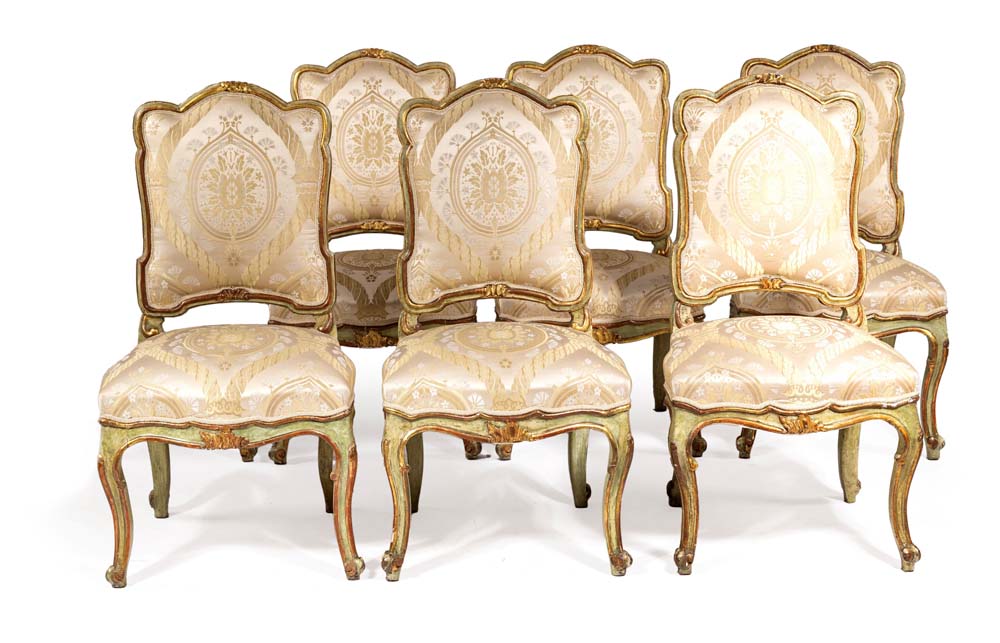 Sei sedie in legno laccato verde pastello con profili dorati, metà del XVIII secolo cornici centrate da rilievi vegetali stilizzati dorati; schienale sagomati e sedili imbottiti, gambe mosse terminanti a ricciolo cm 98x52x45