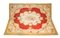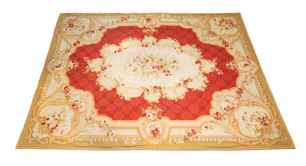 Tappeto Aubusson fondo rosso rubino con disegno "à grillage ton sur ton", Francia, inizi del XIX secolo caratterizzato da un grande medaglione centrale polilobato fondo chiaro ed ampia bordura bianca con tralci sinuosi arricchiti da foglie e da corolle sparse caratteristici della manifattura francese cm 322x376