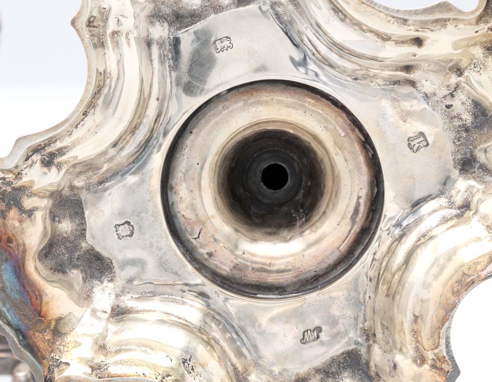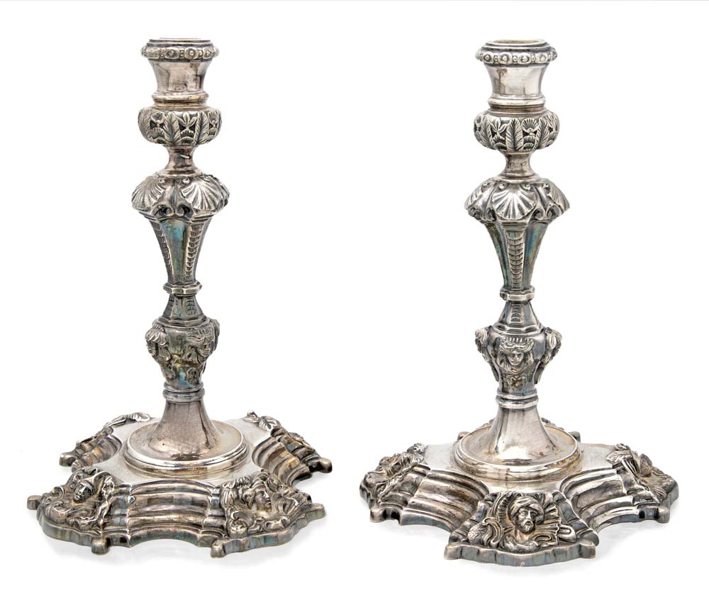 Coppia di candelieri in argento, Londra, 1745, argentiere Thomas Whipham fusti decorati da busti in rilievo, piede quadrilobato modanato con volti in rilievo altezza cm 23 - 2.206