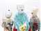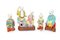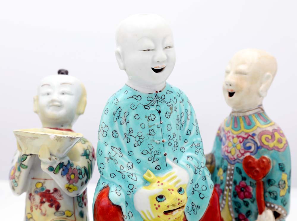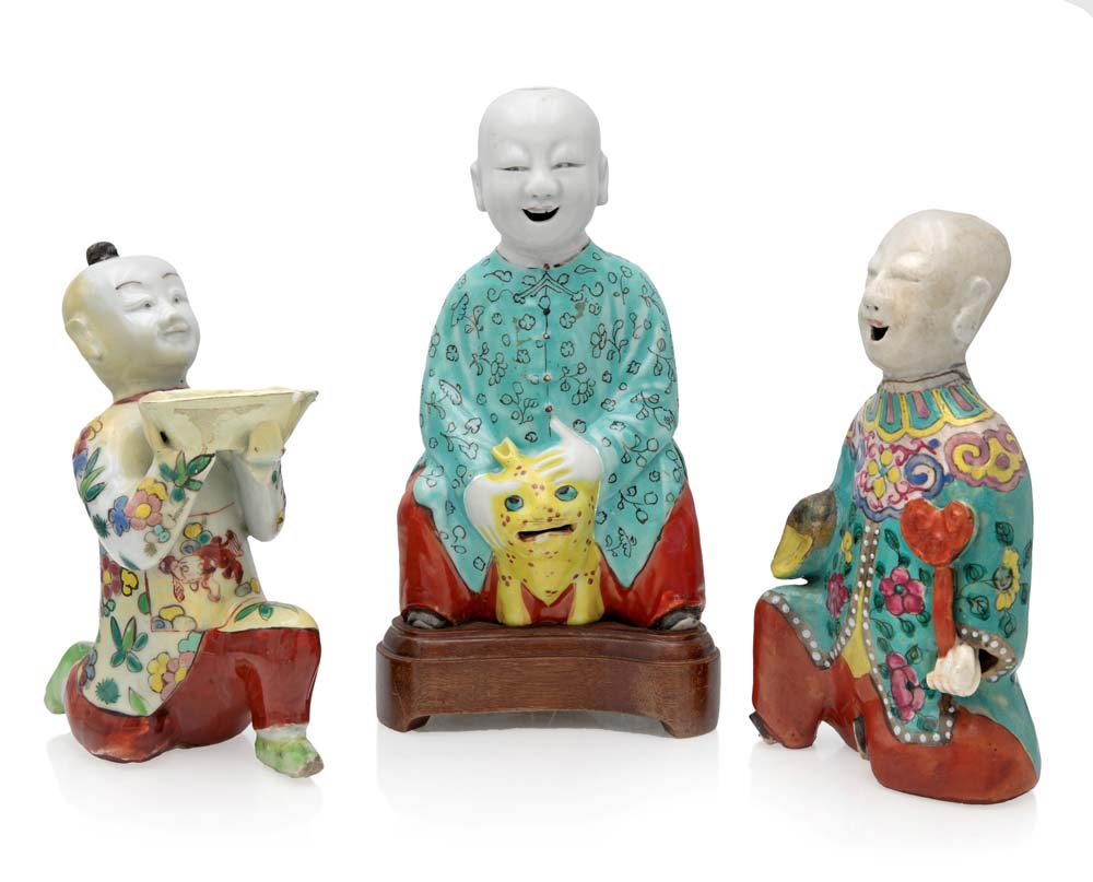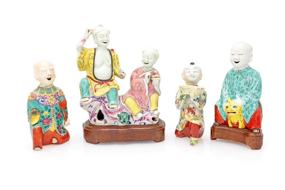 Tre porta bastoncini da incenso figurativi e due Immortali in porcellana policroma, Cina, dinastia Qing due magots inginocchiati, un giovane con coniglio applicato su una basetta in legno e i due immortali ridenti "Hé Hé Er Xian" decorati nei toni della Famiglia Rosa applicate su base in legno altezza cm 15,5 - cm 16,5 e cm 20; il gruppo cm 24x17,5x10,5
