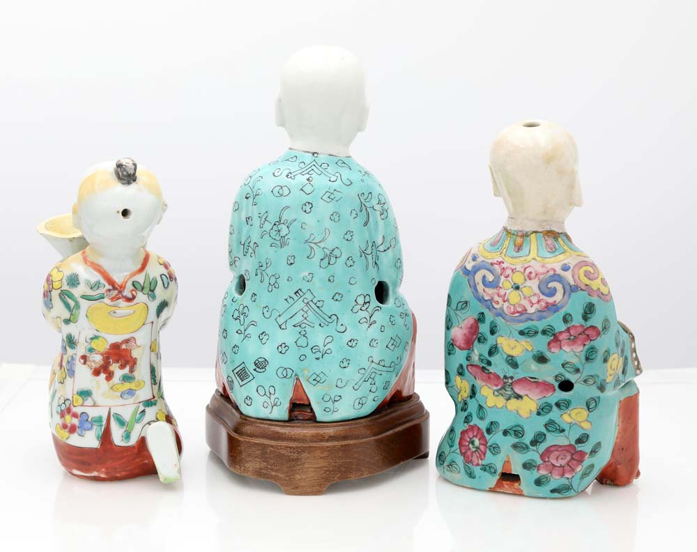 Tre porta bastoncini da incenso figurativi e due Immortali in porcellana...