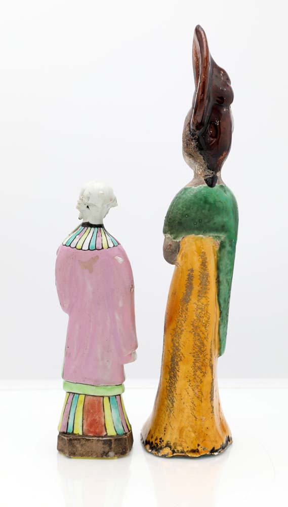 Due figure diverse in ceramica e porcellana policroma, Cina una guanjin con ventaglio e tunica rosa (rotture e restauri) ed una dama di corte in ceramica "Sancai" smaltata a tre colori (verde, giallo e marrone) con volto privo di invetriatura caratteristico della manifattura Sancai della dinastia Tang   altezza cm 18 e cm 28 rispettivamente