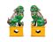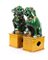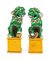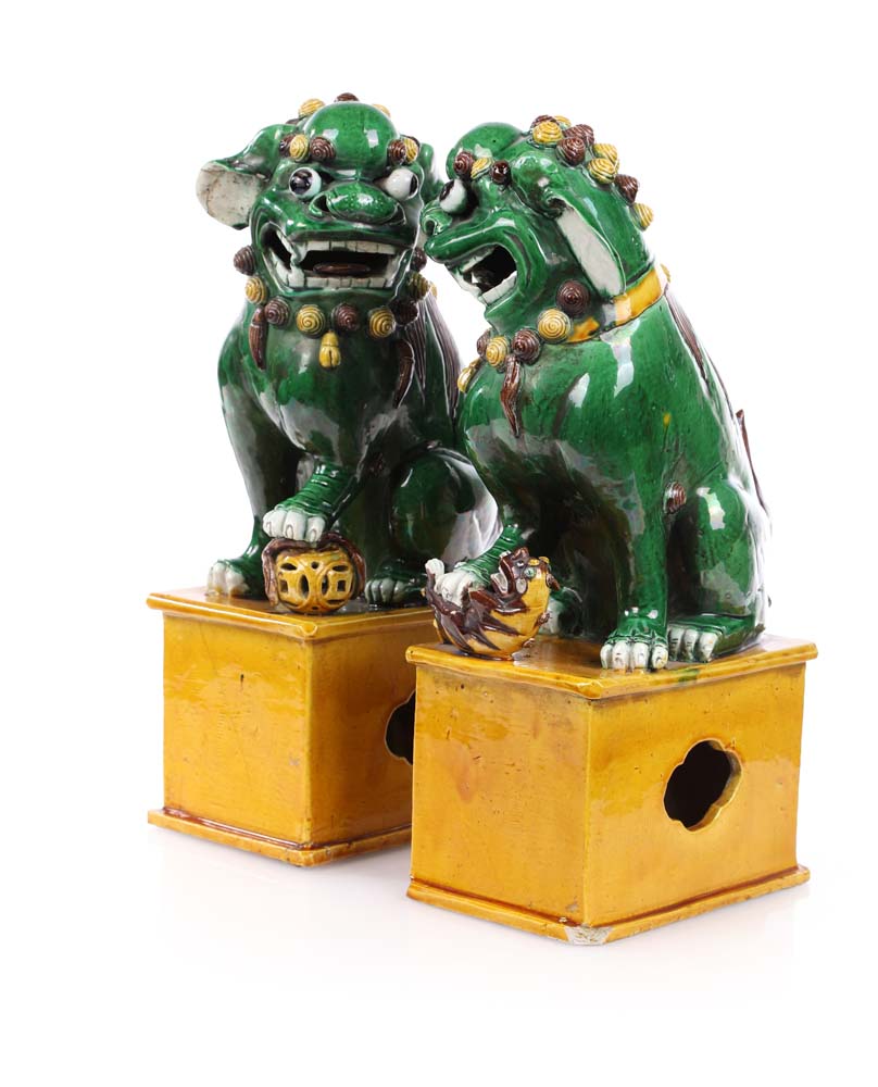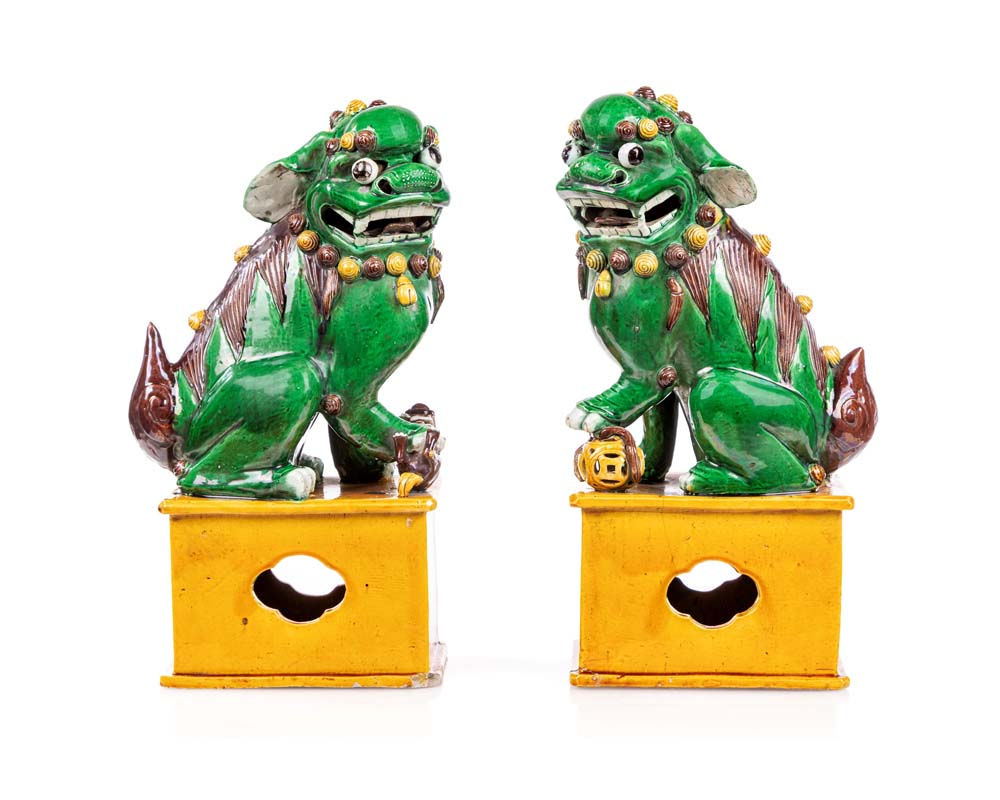 Coppia di leoni guardiani in gres smaltato verde, manganese e giallo, Cina,...
