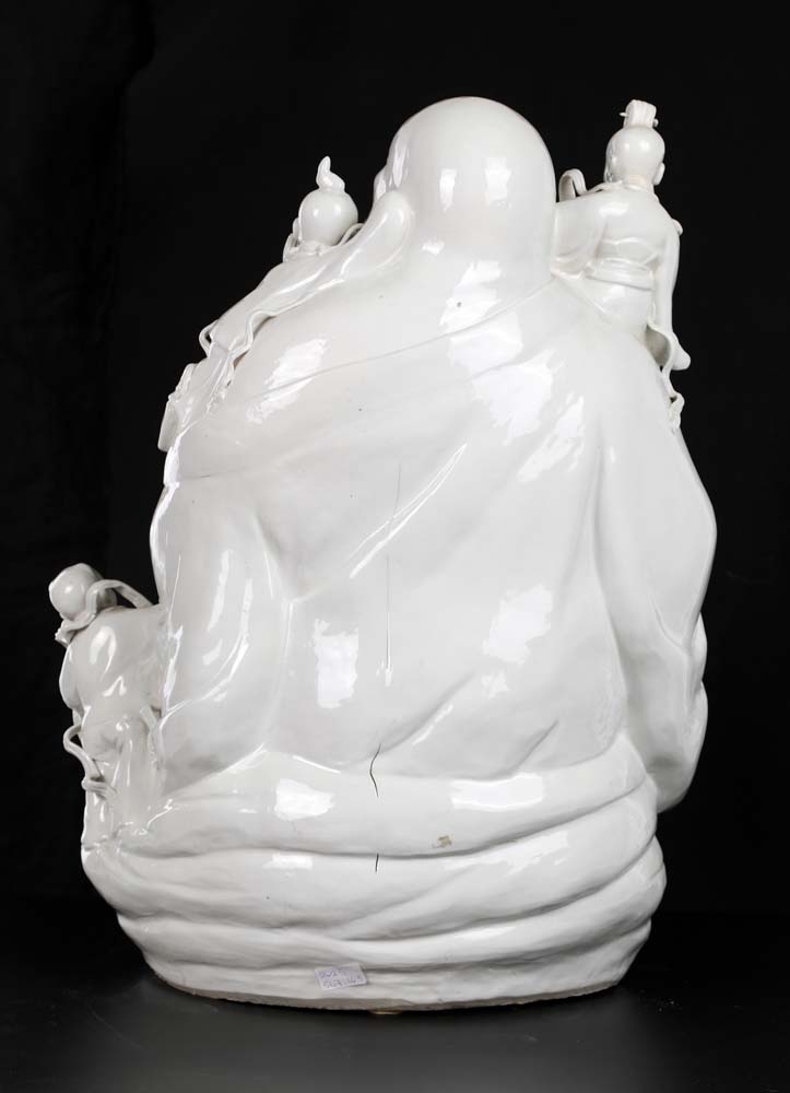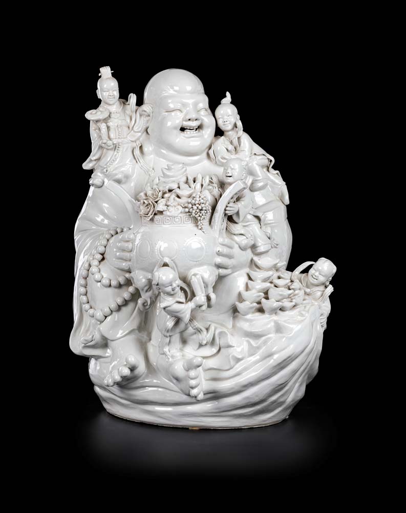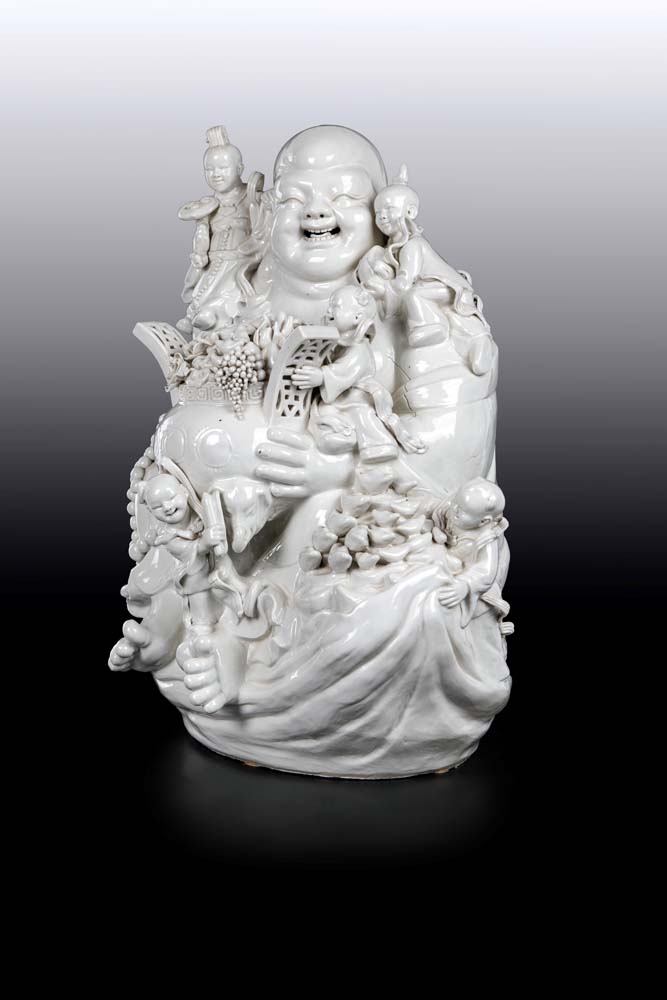 Grande gruppo in porcellana blanc de Chine raffigurante Budai, Cina, dinastia...