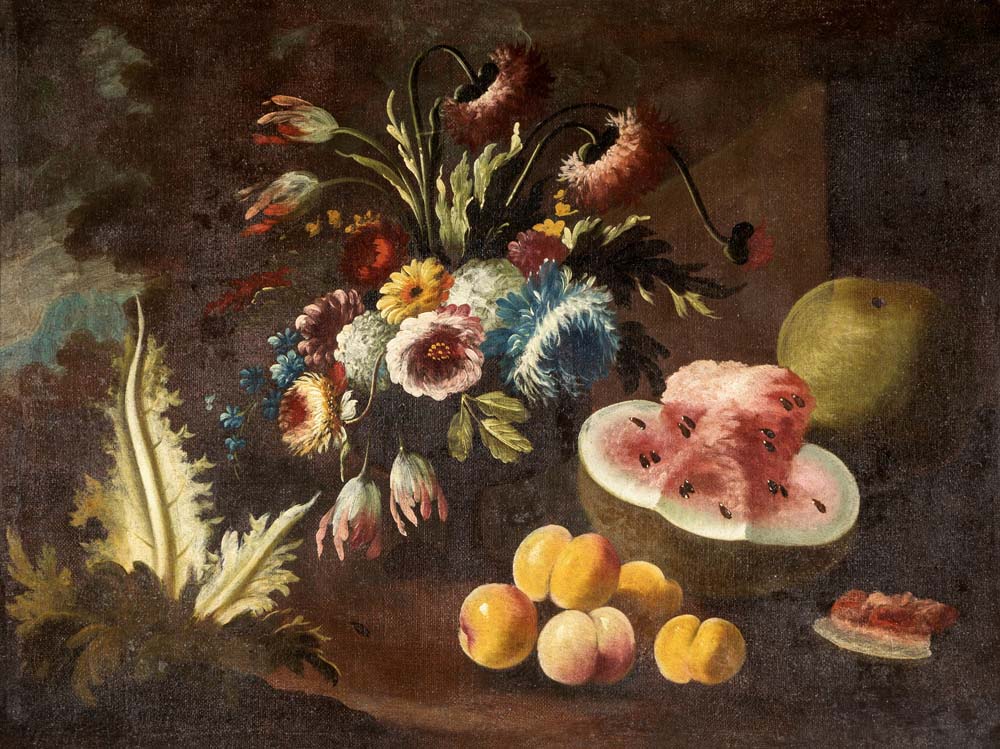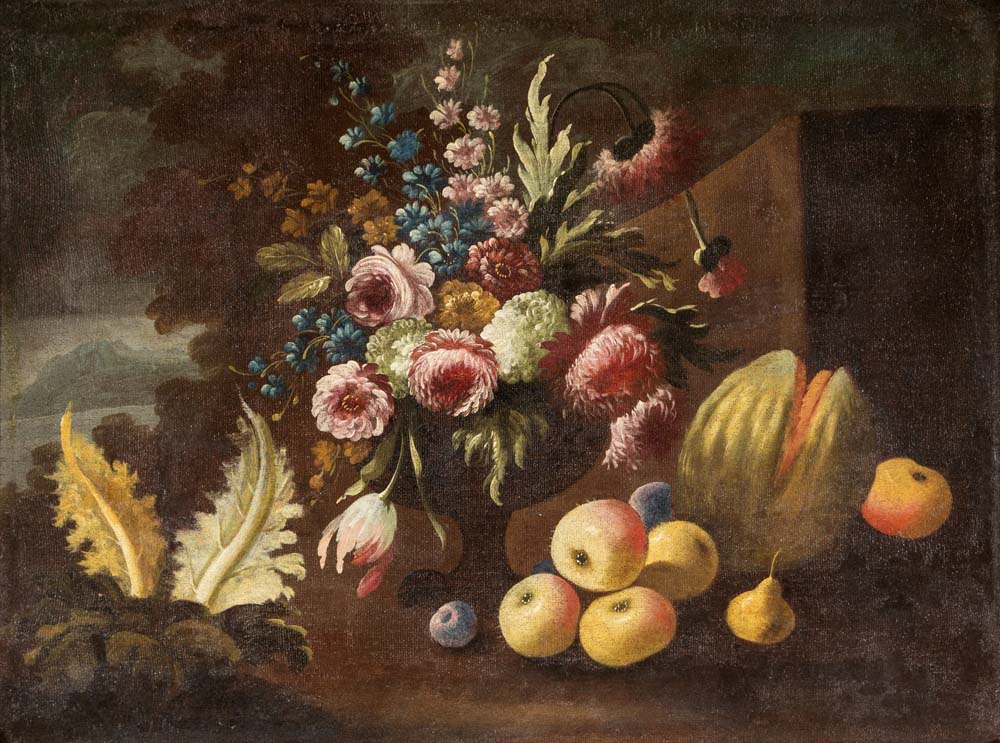 Pittore lombardo del XVIII secolo Coppia di Nature morte con fiori e frutta coppia di olii su tela entrambi cm 75x100 - con cornice cm 90,5x117