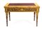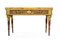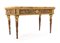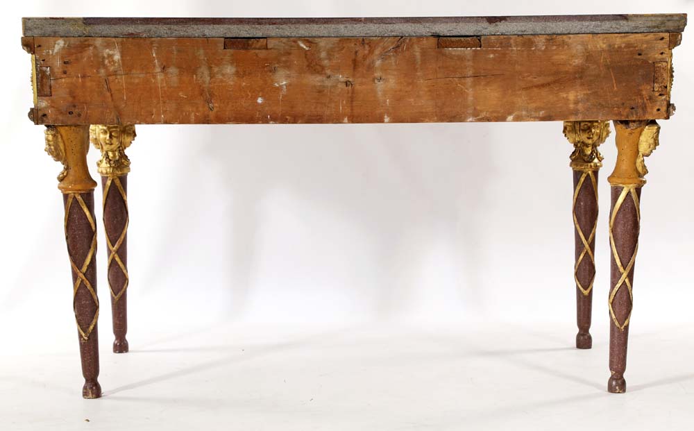 Console in legno laccato e dorato, fine del XVIII secolo rifinita superiormente da piano in porfido con ampia cornice di giallo antico, reca fascia lineare centrata da medaglione con figure a cammeo affiancato da girali con rilievi vegetali e corolle intagliate emergenti dal fondo laccato ad imitazione del porfido, rilievi decorativi interrotti agli angoli da placche con profili classici; gambe rastremate idealmente avvolte da nastri, con capitelli scolpiti ed intagliati caratterizzati da quattro volti dalle analoghe caratteristiche, con tratti stilizzati ma espressivi, orientati verso i punti cardinali come ad osservare lo spazio circostante da ogni direzione, conferendo al capitello stesso un valore non solo strutturale ma anche simbolico, legato all’idea di protezione e sacralità dello spazio. cm 96x160x78