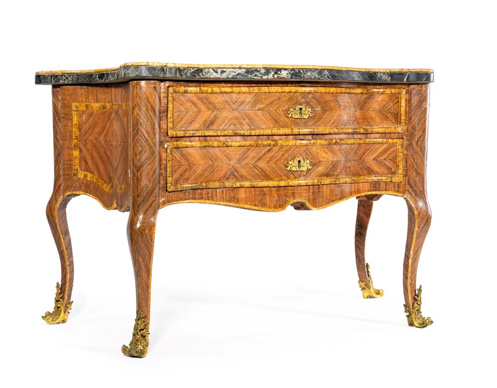 Dal punto di vista stilistico, i cassettoni si collocano nell’alveo del tardo Rococò romano con aperture verso il primo Neoclassicismo, come suggeriscono da un lato la morbidezza delle linee e il profilo mosso delle gambe, dall’altro la crescente regolarità della partitura decorativa. La scelta del bois de rose dipinto richiama modelli francesi filtrati però attraverso una sensibilità romana più misurata, nella quale la struttura architettonica prevale sull’esuberanza ornamentale. cm 86x130x65