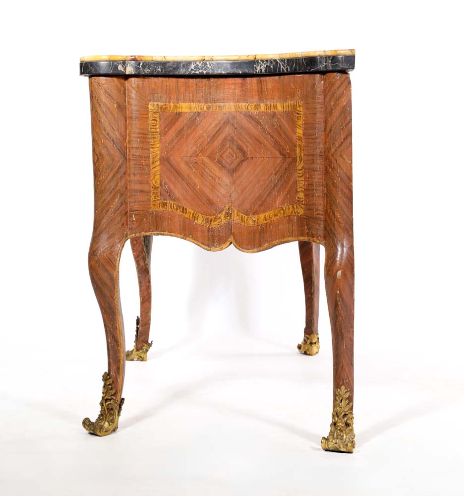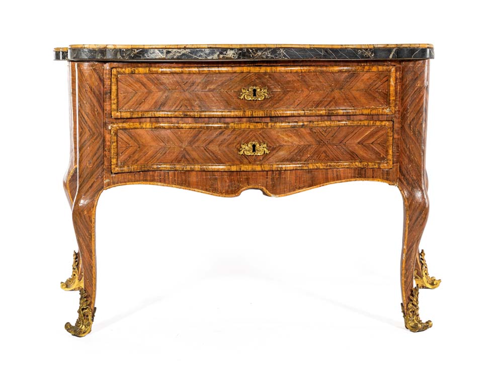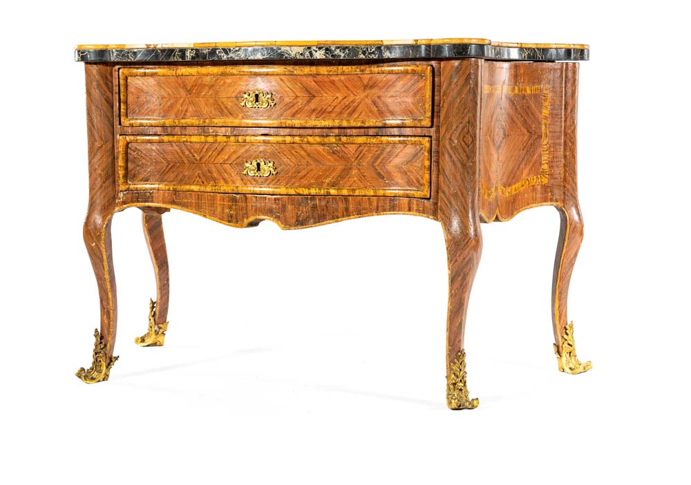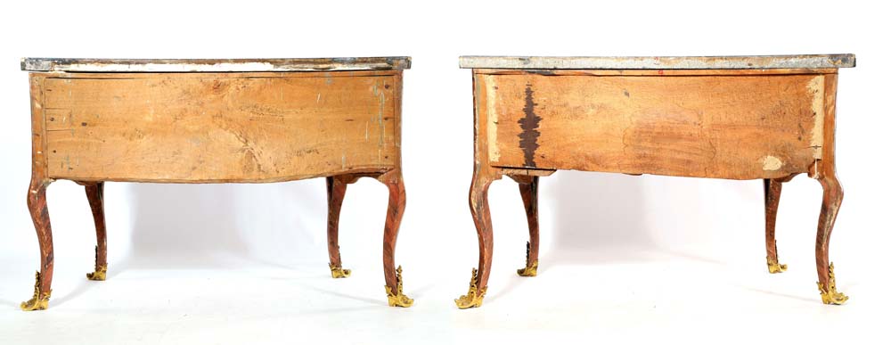 Coppia di cassettoni in legno dipinto ad imitazione del bois de rose, Roma, XVIII secolo di forma mossa con due cassetti frontali incorniciati da sottili profilature dipinte, sono rifiniti superiormente da piani sagomati in marmo nero d'Aquitania con cordolo giallo; gambe sagomate calzate da scarpette in bronzo cesellato e dorato.