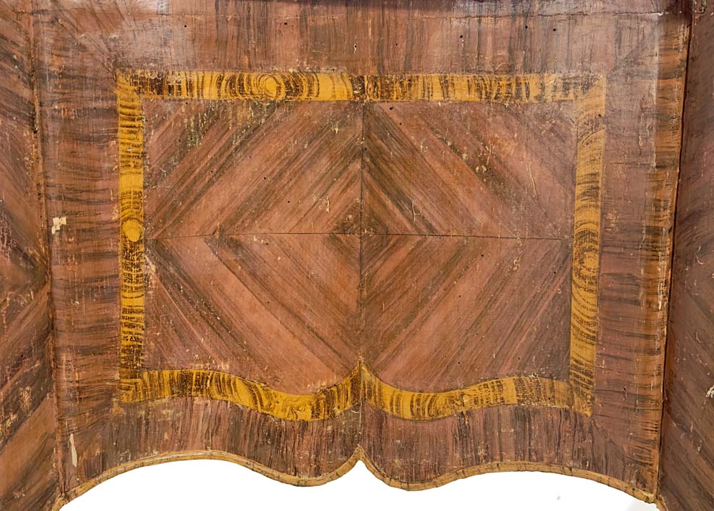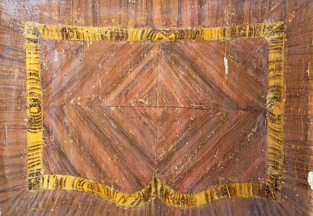 Questa raffinata coppia di cassettoni romani testimonia l’alto livello raggiunto dalla produzione ebanistica capitolina nella seconda metà del XVIII secolo, quando la pittura decorativa ad imitazione delle essenze pregiate si afferma come elegante alternativa all’impiego diretto dei legni esotici. La superficie, dipinta a simulare il bois de rose, riproduce l’andamento della venatura e la calda tonalità rosata del legno, arricchita da riserve geometriche e filettature che scandiscono con equilibrio l’architettura del mobile.