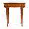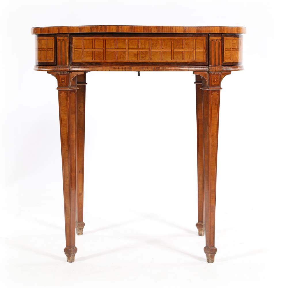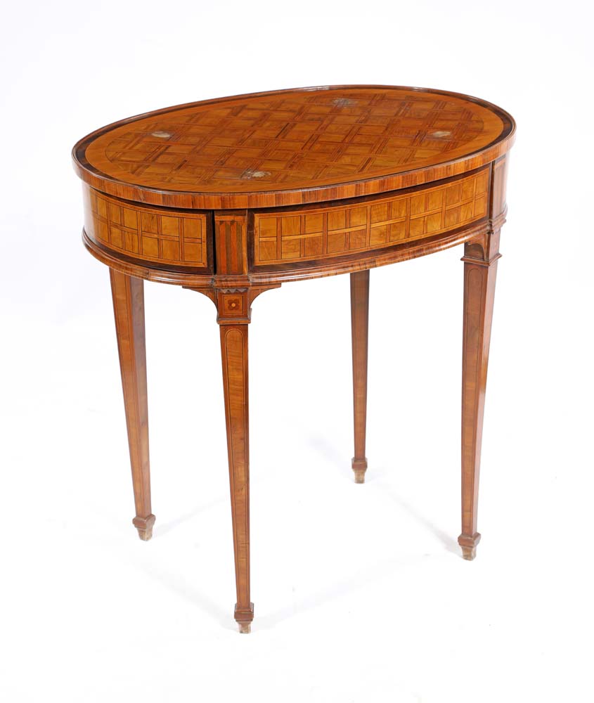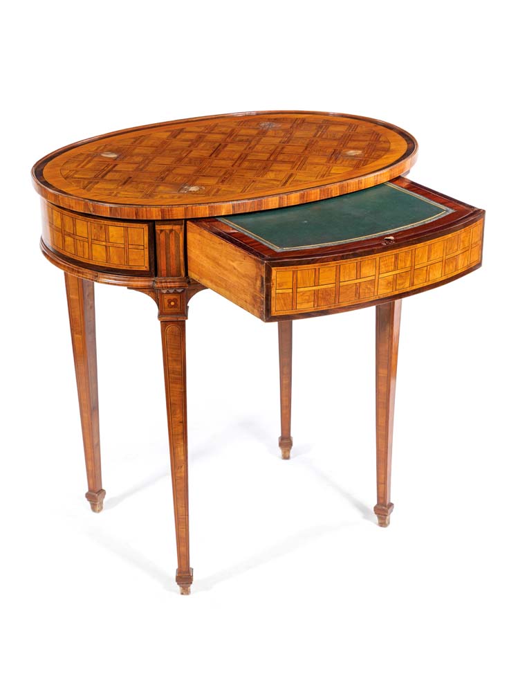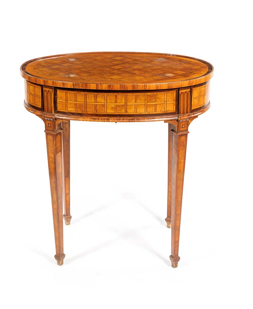 Tavolino ovale Luigi XVI con filettature disposte a creare riquadri geometrici; un cassetto nella fascia con apertura a scatto mediante un pulsante posto la fascia; all'interno un ripiano scorrevole rivestito in pelle e due tiretti, gambe rastremate cm 74x72x52