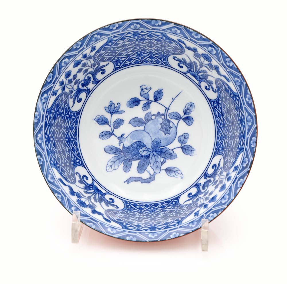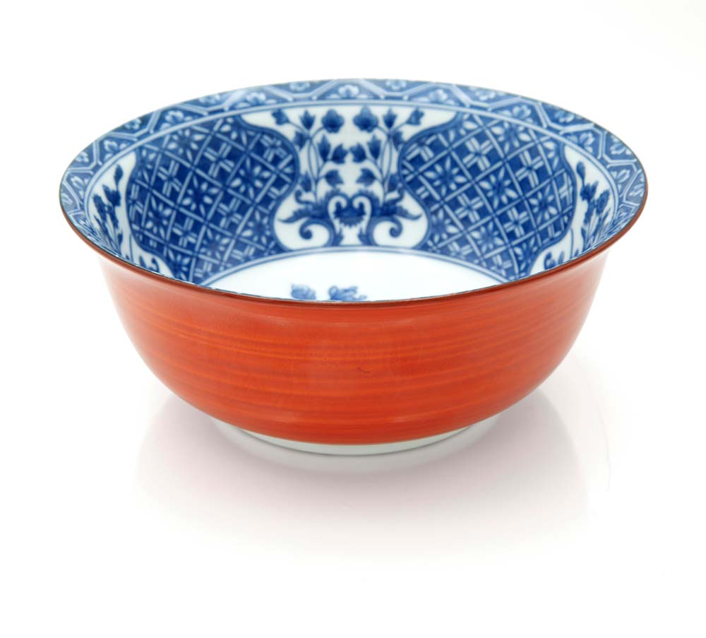 Ramen bowl in porcellana, manifattura di Arita per l'esportazione, Giappone, XX secolo decorata esternamente in monocromia rosso ferro e all'interno in monocromia blu su fondo bianco; al centro un tralcio con melagrane e lungo il bordo quattro riserve sagomate con composizioni floreali su fondo a grillage centrato da corolle. Reca marchio in blu sottosmalto ed etichetta del rivenditore "Carini" cm 6,5x16,5