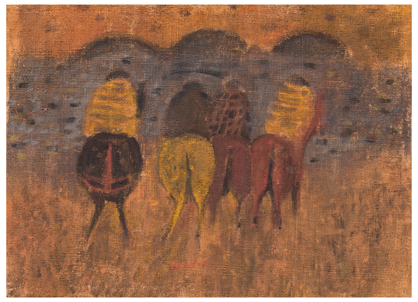 Nell'opera di Veneto Banca il linguaggio è già quello del primo periodo astratto di Mušič (circa 1951–57): le linee curve dominano la composizione, unificando manti, colline e superfici; la materia è asciutta, quasi terrosa; le figure – gialle, brune, rossastre – emergono da un fondo caldo che richiama le pietraie dalmate. Le macchie scure e la trama della tela a vista accentuano il carattere atmosferico, sospeso, quasi trasognato della scena. La processione dei cavalli è resa attraverso sottili variazioni cromatiche e segni minimi: piccoli punti, reticoli obliqui, striature che trasformano i corpi animali in elementi ritmici, ormai più vicini al segno che allo studio dal vero.