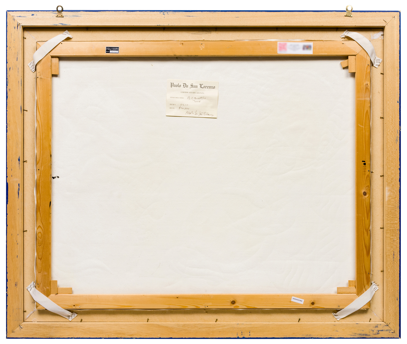 Elementi distintivi: al verso della tela, etichetta con certificato di garanzia e dati dell’opera; sul telaio marchio con indicazione della misura e due etichette con riferimenti inventariali, una della Cassa di risparmio di Fabriano e Cupramontana e l’altra anonima