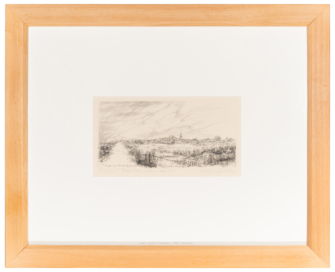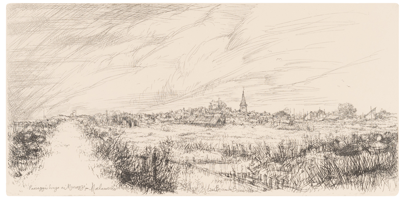 Altre iscrizioni: “VI/XX p. d’a.”, “Paesaggio lungo i Muracci in Malamocco” al recto a matita; “Paesaggio lungo ai Murazzi. Malamocco” in lastra