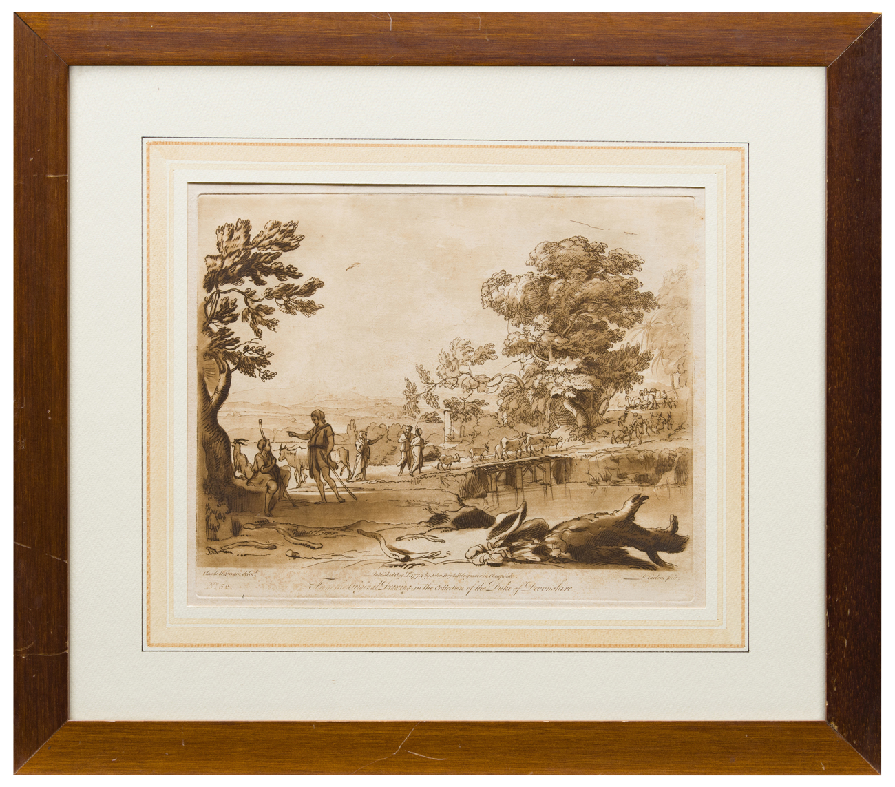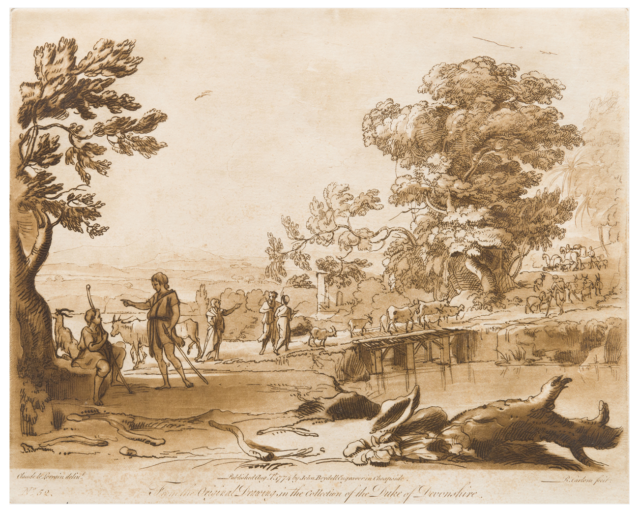 Pubblicato il 1 novembre 1774 dal celebre editore John Boydell (1720-1804), Cheapside, fu inciso da Richard Earlom (1743-1822) da uno schizzo dall'esemplare del 'Liber Veritatis' di Claude Lorrain conservato nella collezione del Duca di Devonshire a Chatsworth. Claude, prolifico e apprezzato paesaggista, subì falsificazioni delle sue opere già in vita, che fronteggiò realizzando sei album di schizzi acquarellati dei suoi lavori, indicando per ogni opera il nome del proprietario sul verso dello schizzo. Il 'Liber Veritatis' fu poi distribuito in Europa in modo da consentire l'autenticazione dei suoi dipinti genuini. L'esemplare di Chatsworth del 'Liber Veritatis' contiene 200 disegni, inclusi il ritratto di Claude in frontespizio e cinque disegni non relazionati ad opere. Su commissione di John Boydell, Richard Earlom incise l'intero album tra il 1774 il 1777. L'opera venne pubblicata in due volumi, ognuno contenente 100 stampe, con numerazione 1-200. Un terzo volume, anch'esso di 100 stampe, fu pubblicato da Boydell nel 1819, con una numerazione apposita, con mezzotinti che Earlom trasse da disegni di Claude in varie collezioni.