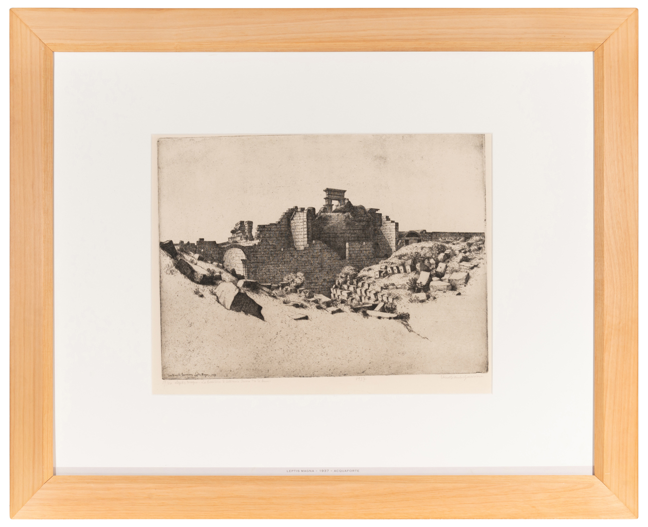Altre iscrizioni: tiratura “17/50”, “Leptis Magna. La Basilica di Settimio Severo tra le dune” al recto a matita; “Leptis Magna” in lastra