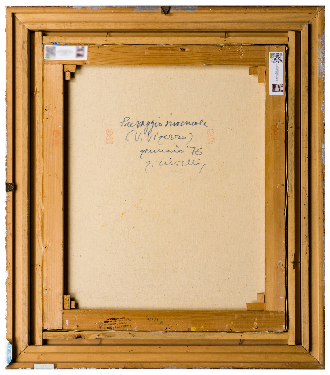 Elementi distintivi: sul telaio e sulla tela, timbri dell’artista; sul telaio inoltre timbro della coloreria “SMERALDI GINO” di Domodossola; etichetta con della Banca Popolare di Intra con riferimento inventariale