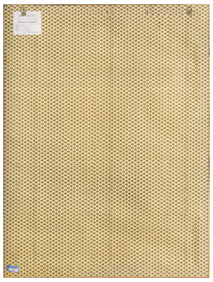 Elementi distintivi: al verso etichetta della galleria Martinazzo, Montebelluna, con dati dell’opera e certificato di originalità; etichetta con riferimento all’inventario della banca