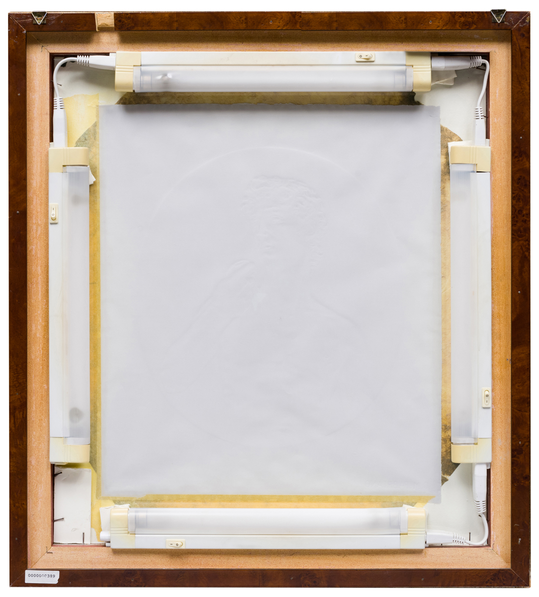 In asta, un esemplare di filigrana artistica in chiaroscuro, realizzata da Franco Librari, per la storica Cartiera Miliani, di Fabriano, sul modello celeberrimo del "David" di Michelangelo. Come ricorda Annarita Librari, figlia di Franco Librari, "Con Giuseppe Miliani (1816 - 1890), nipote di Pietro (1744 - 1817), fondatore della ditta Miliani, la cartiera si ingrandisce, la carta da disegno si afferma come la migliore, tanto che alla esposizione di Londra nel 1851 viene premiata, e la carta valori comincia ad essere la specialità della fabbrica fabrianese. Alla morte di Giuseppe la cartiera era già un grande complesso, ma sarà il figlio Giambattista (1856-1937) ad operare l’effettiva trasformazione da azienda artigianale ad industriale (...). Giambattista alle conoscenze tecniche unisce un’ampia visione dell’organizzazione industriale grazie ai frequenti viaggi che, fin da giovanissimo, compie in diverse nazioni europee e in Nord America. Nel 1889 riceve la Legion d’onore per aver presentato, all’esposizione di Parigi, le migliori filigrane per i biglietti di banca. Per le filigrane di Fabriano, ancor prima del riconoscimento parigino, esisteva un vero e proprio entusiasmo. Nel 1886 Ernst Kirchner di Francoforte sul Meno scrive: “Le vostre carte filigrane sono le più belle che io abbia mai veduto fino ad ora. Da quando posseggo questi veramente artistici fogli non oso più nemmeno guardare gli stessi prodotti della Germania. I ritratti, come pure i dettagli che li ornano sono di una finezza ammirabile, perfetta e formano ora il punto essenziale di questa modesta collezione che io curo con molto amor proprio”. Nel settore della Filigrana artistica in chiaro-scuro per banconote Giambattista, in un primo momento, per l’incisione su cera si avvalse del prof. Bianchi di Roma, medaglista dei Sacri Palazzi Apostolici, che direttamente da Roma inviava a Fabriano le cere commissionate. Successivamente, la sua lungimiranza e previdenza lo spinsero a dotare l’Officina Filigrane delle cartiere di Fabriano della sezione di incisione su cera, dove destinò giovani e abili artisti che riuscirono a soddisfare appieno le esigenze aziendali. Capostipite di questa scuola fu Serafino Cilotti (1868-1943), che realizzò opere di notevole impatto artistico, da considerare come una nuova forma di espressione d’arte figurativa su cera, Angelo Bellocchi (1880-1939) e Virgilio Brozzesi (1869-1946). Allievi di Cilotti possono considerarsi Aldo Frezzi (1885-1972), (...) Eraldo Librari (1907-1988) e Luigi Filomena. Luigi Casoni fu incisore delle Miliani fino al 1958, quando fu chiamato dalla Banca d’Italia per incidere le “testine” delle banconote." "Eraldo Librari apprese quest’arte soprattutto osservando Serafino Cilotti mentre incideva, o meglio “rubando con l’occhio” attento e predisposto, avendo già alle spalle una preparazione artistica e una innata attitudine verso le più svariate forme d’arte. Entrò in Cartiera dopo aver vinto un concorso, rispettando la tradizione familiare che aveva visto il padre Decoroso e il nonno Angelo lavorare nella prestigiosa fabbrica fabrianese come lavoranti al reparto tini. Eraldo, da giovane, dopo aver frequentato la scuola professionale, fu allievo intagliatore del Prof. Ivo Quagliarini di Fabriano, lavorando nel suo mobilificio; fu un abile e fecondo scultore realizzando numerosi busti di noti personaggi fabrianesi dell’epoca; fu autore di numerose poesie e un compositore di canzoni; incisore su cera di numerose opere d’arte di grandi dimensioni e di testine per banconote, settore trainante dell’azienda, quest’ultime precedute da numerosi disegni preparatori a matita e a china, in un’epoca dove tutto era affidato all’abilità manuale dell’artista. Le incisioni di grandi dimensioni, che l’azienda faceva realizzare ai suoi più validi incisori, per fine propagandistico e d’immagine, non sono delle semplici e fredde riproduzioni di opere d’arte o ritratti, ma il frutto di una personale interpretazione che si riflette in uno stile espressionistico e scultoreo (dove un semplice elemento paesaggistico, come una pianta, viene reso con la minuzia di un botanico, le espressioni dei volti riflettono il pathos del personaggio ritratto), influenzato dal suo coinvolgimento emotivo e dalla sua sensibilità. Si tratta di un coinvolgimento che lo porta quasi a dimenticare il fine dell’incisione su cera - come fase principale di un lungo processo che richiede alcune particolari accortezze tecniche - e a trattarla come un’opera scultorea finale o come un pezzo di legno da intagliare, dove la materia deve essere rimossa di getto per far emergere l’immagine che racchiude al suo interno. Entrambi i figli di Eraldo Librari, Franco (mio padre) e Sandro (mio zio) appresero quest’arte dell’incisione su cera all’interno delle mura domestiche, ma solo mio padre Franco riuscì ad essere assunto nel 1963 in cartiera, dapprima nell’officina filigranisti come apprendista. Rispetto a molti incisori, mio padre ha saputo sfruttare al meglio il fatto di aver lavorato per anni nell’officina filigranisti, dove si svolgevano le fasi successive all’incisione su cera (galvanoplastica, ritocco dei punzoni, punzonatura della tela e realizzazione della forma filigranatrice). Questo gli ha permesso di rendersi conto di tutte le difficoltà che si incontravano nelle fasi successive, se l’incisione non era realizzata secondo alcuni accorgimenti tecnici. Spesso si trovava di fronte a delle incisioni veramente artistiche, ma alle quali bisognava sacrificare alcuni aspetti di quella espressività, perché avrebbero creato problemi insormontabili per la realizzazione delle fasi successive. Il ritocco dei punzoni era la fase più delicata, perché la presenza di sottosquadri non avrebbe permesso la punzonatura della tela metallica creando degli strappi nella stessa. Se si considera che spesso a ritoccare questi lavori non erano nemmeno gli stes