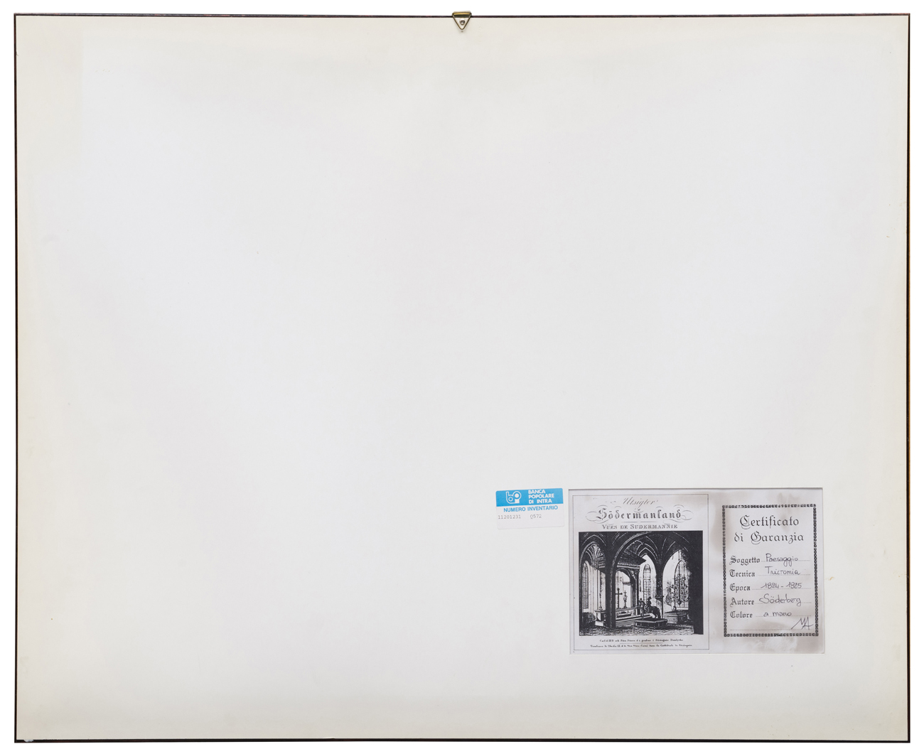 Elementi distintivi: sul verso certificato di garanzia con riferimenti di tecnica e autore; etichetta della Banca Popolare di Intra con riferimenti di inventario