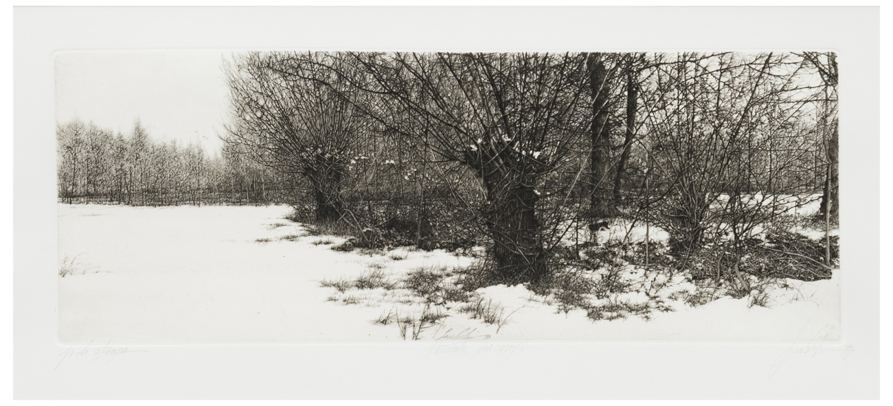 Altre iscrizioni: tiratura “p. di stampa” al recto a matita; “Nevicata sui campi” al recto a matita; “98” in lastra