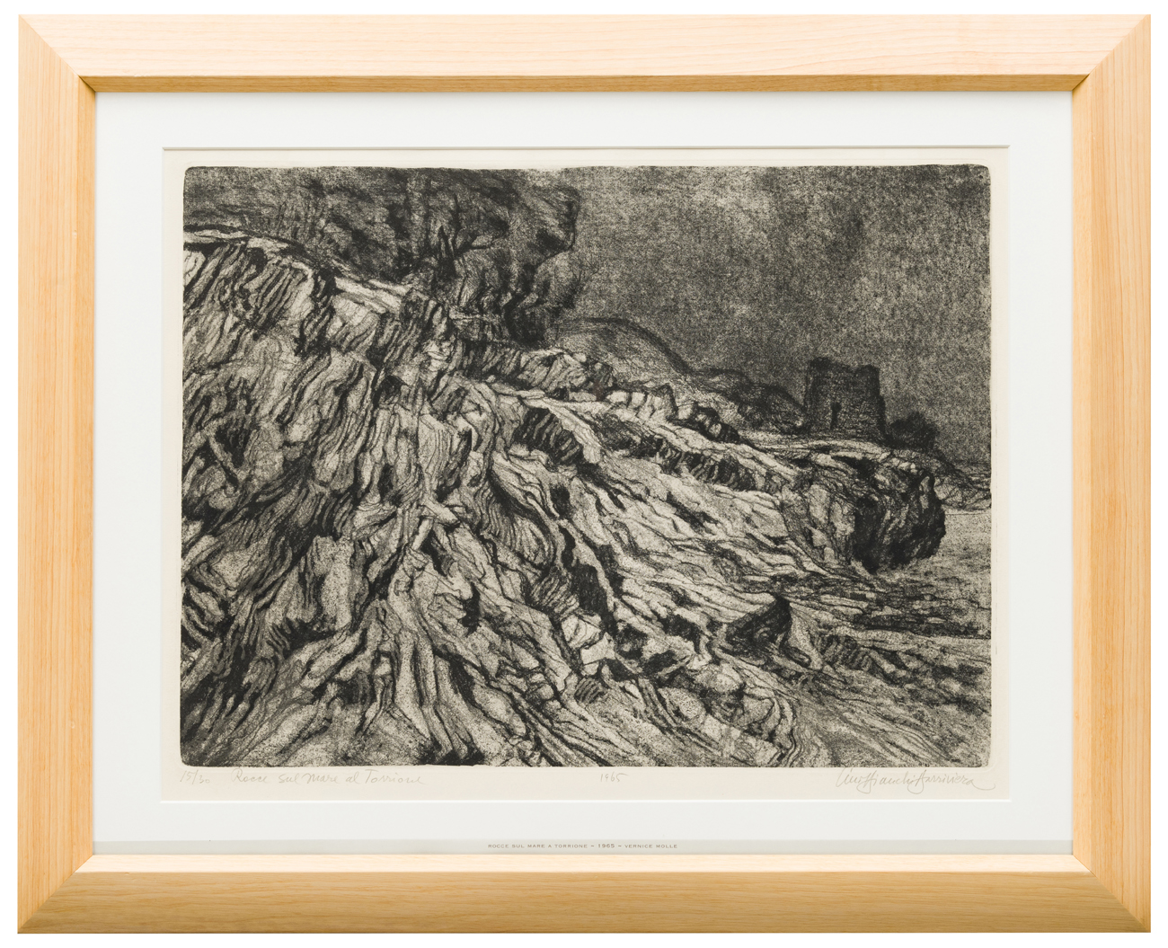 Altre iscrizioni: tiratura “15/30”, “Rocce sul mare al Torrione” al recto a matita