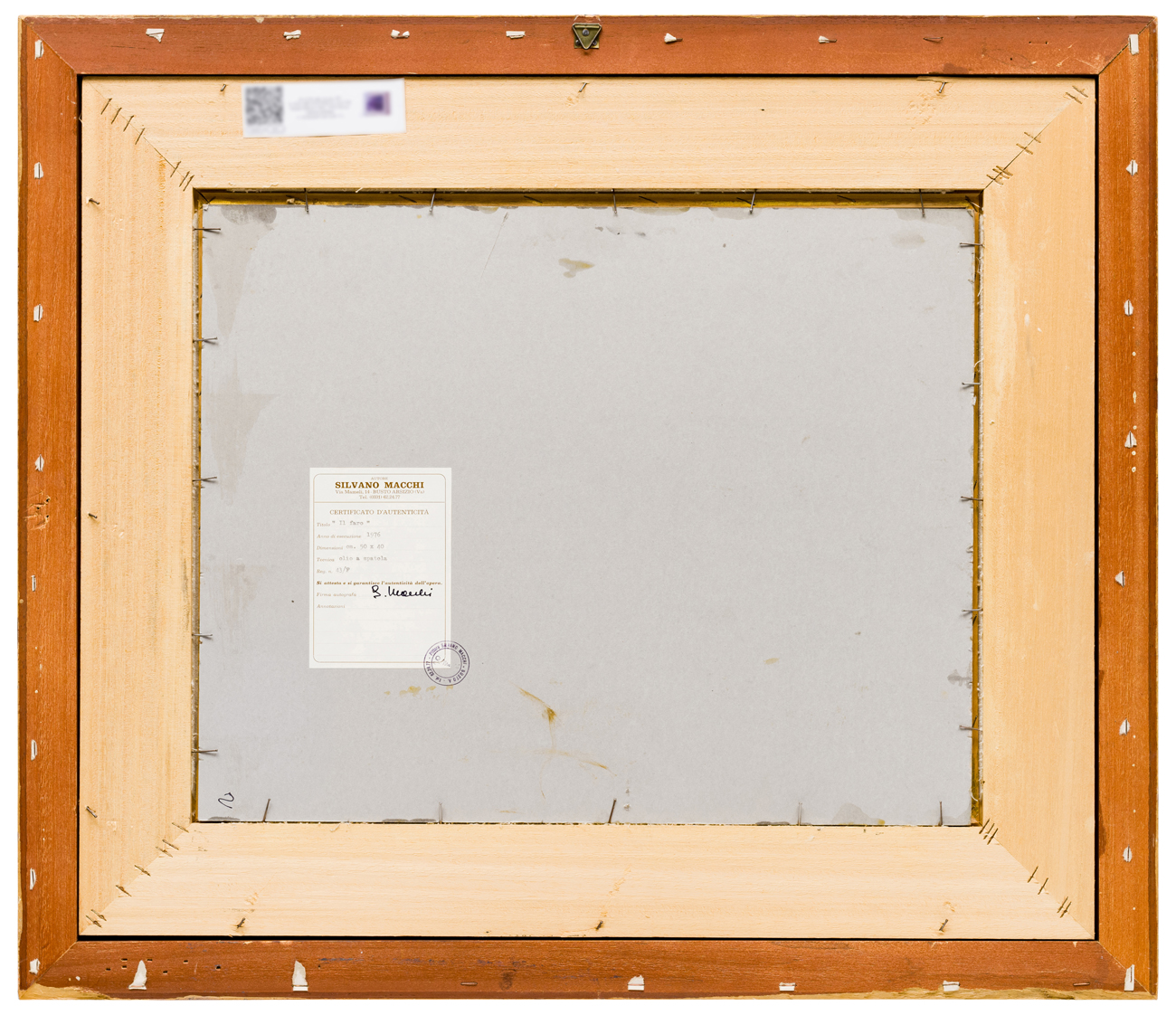 Certificati: sul verso, certificato di autenticità con titolo, anno, misure, tecnica e firma dell’artista