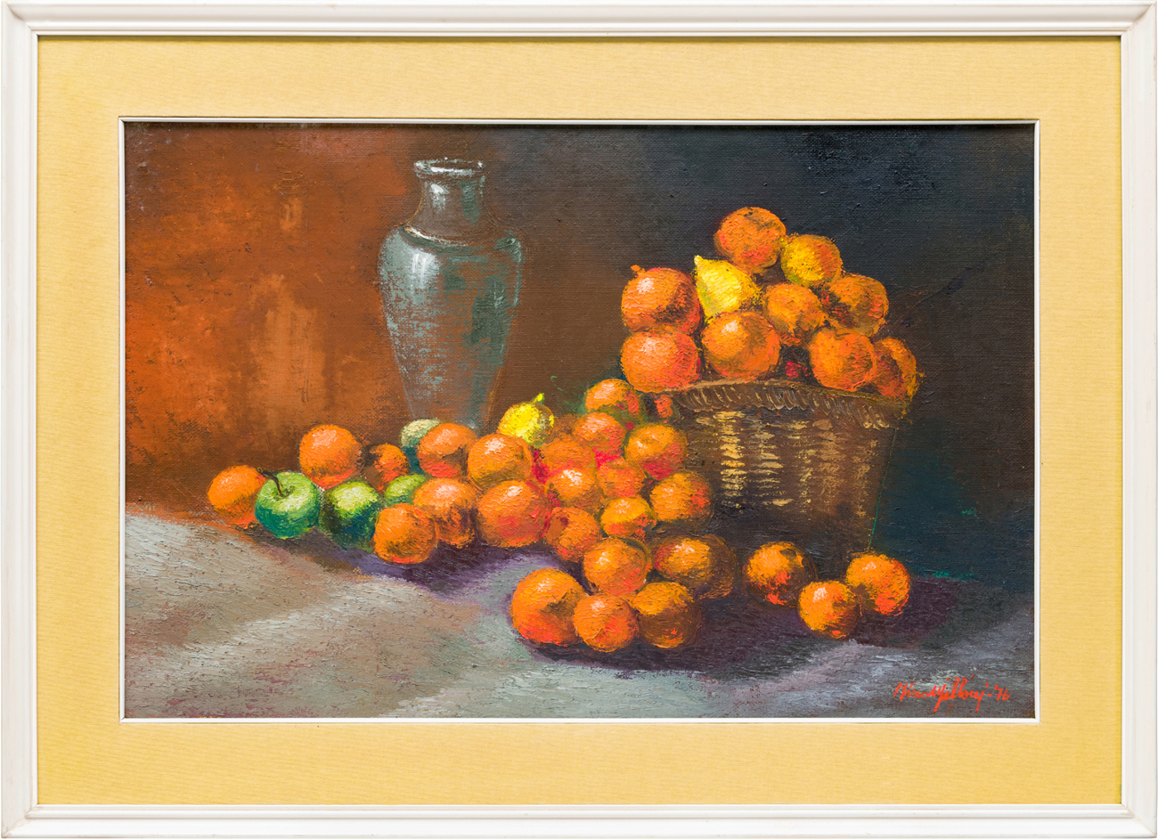 Nino Melloni (1930) Natura morta con vaso, cesto e frutta, 1976