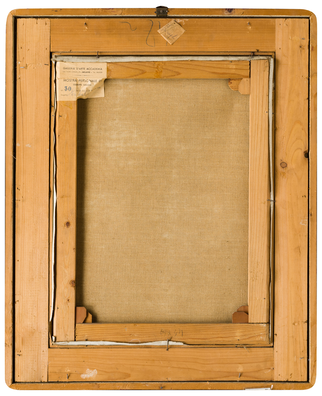 Elementi distintivi: sul verso, etichetta di esposizione della Galleria d’Arte Accademia, Milano; etichetta con nome dell’artista