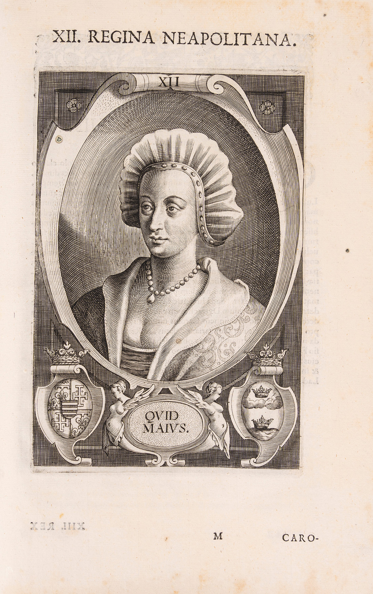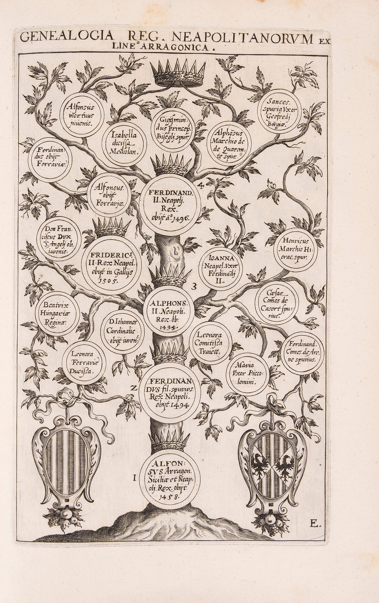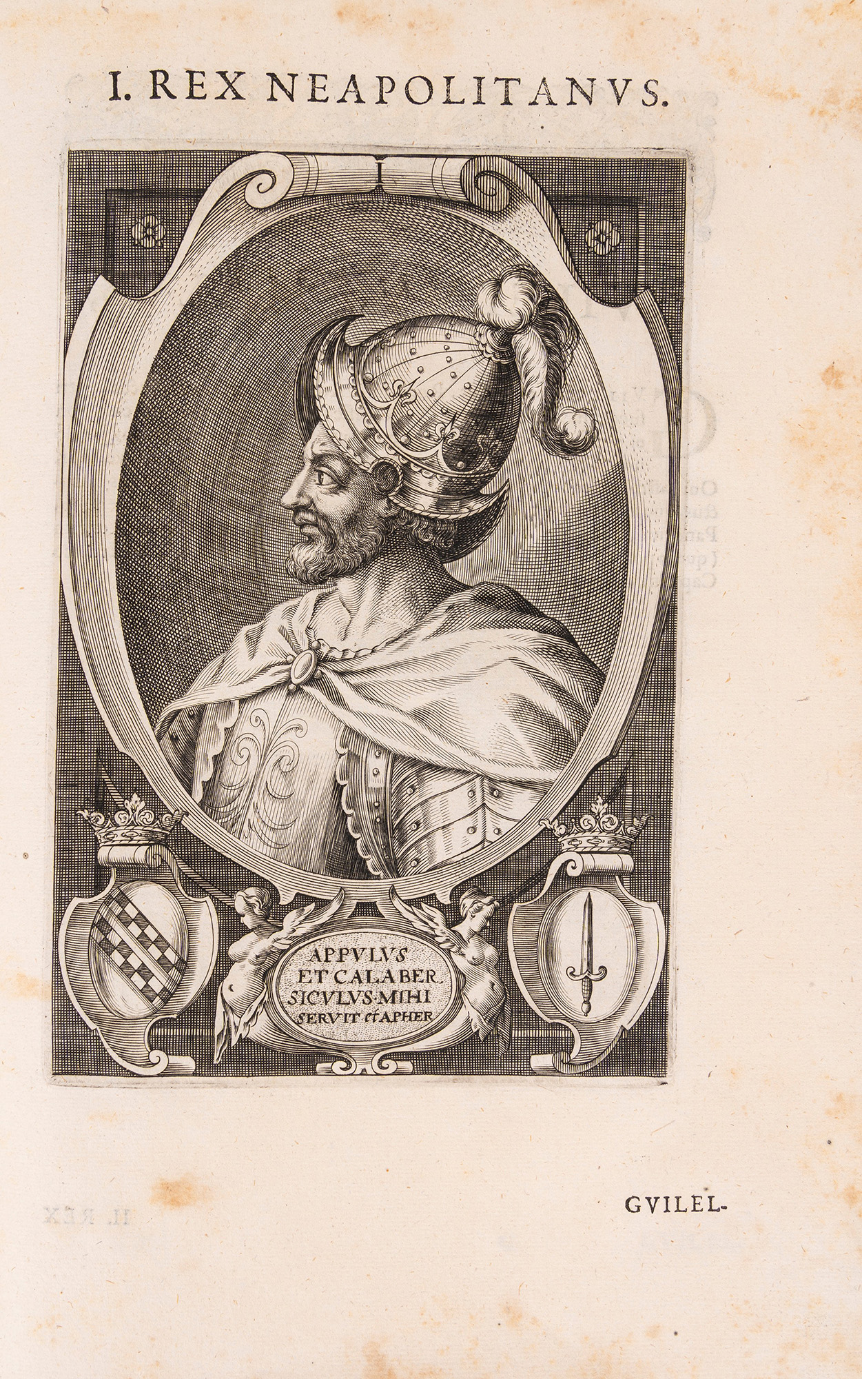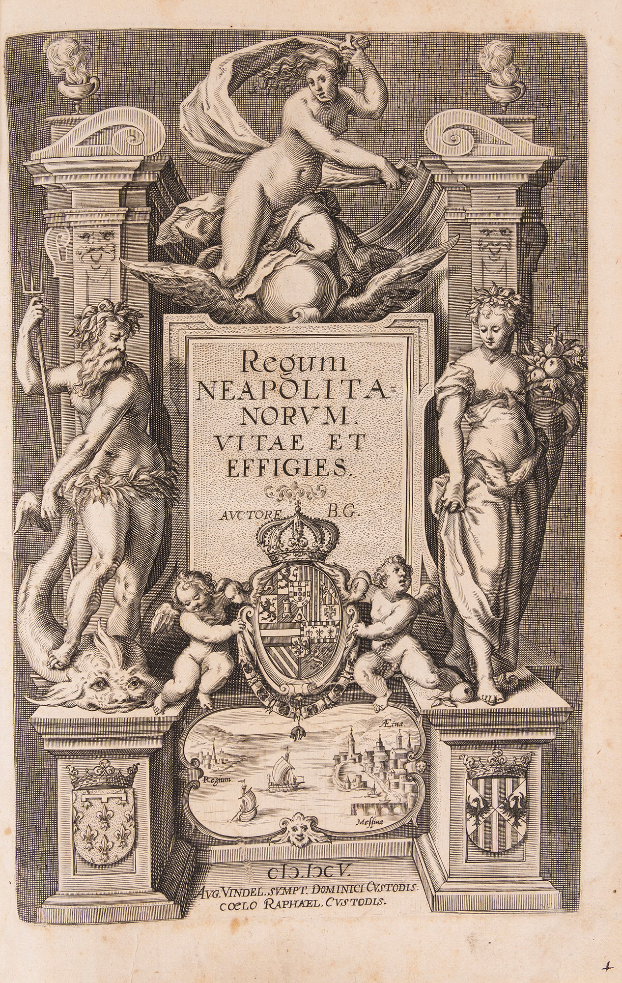 Augustae Vindelicor : typis Iohan. Praetorii : sumtib. Dominici Custodis, 1605. In 2°. Frontespizio finemente istoriato con figure allegoriche, stemma reale di Spagna e vedute delle città di Messina e Reggio, con 6 tavole di alberi genealogici, testatine e lettere figurate, 25 effigi protette da velina, tabella cronologica riepilogativa, vignetta al colophon, piccolo foro a D1, fioriture marginali, rimontato su legatura coeva in pelle, piatto inquadrato da cornice dorata, fregi al frontespizio, lievi segni di usura. Ex libris cartaceo al contropiatto.