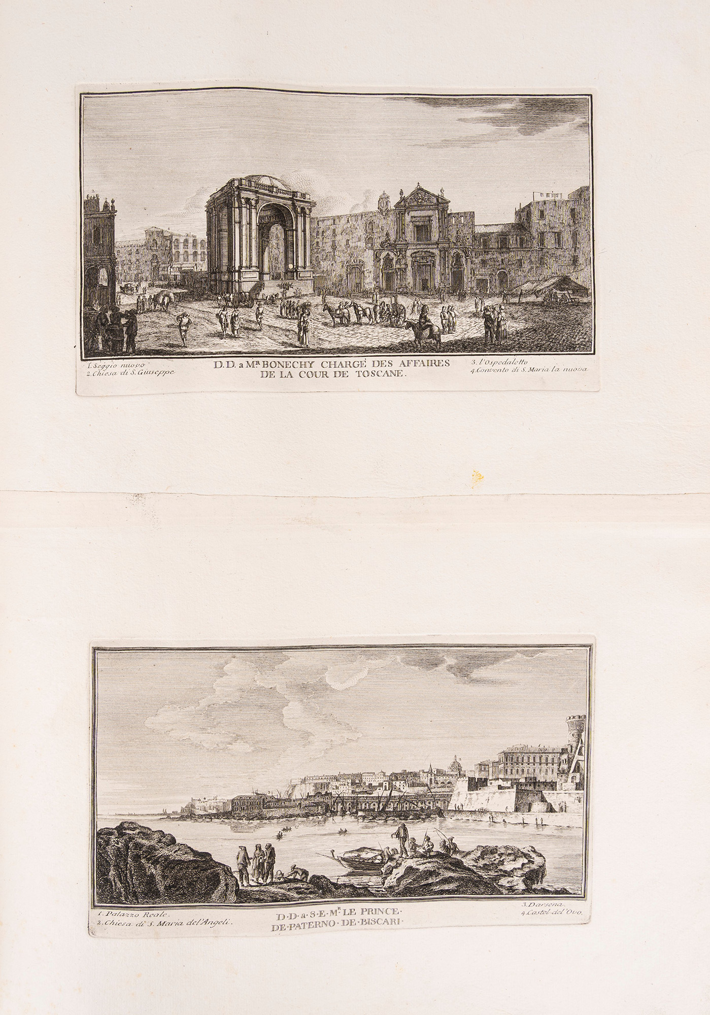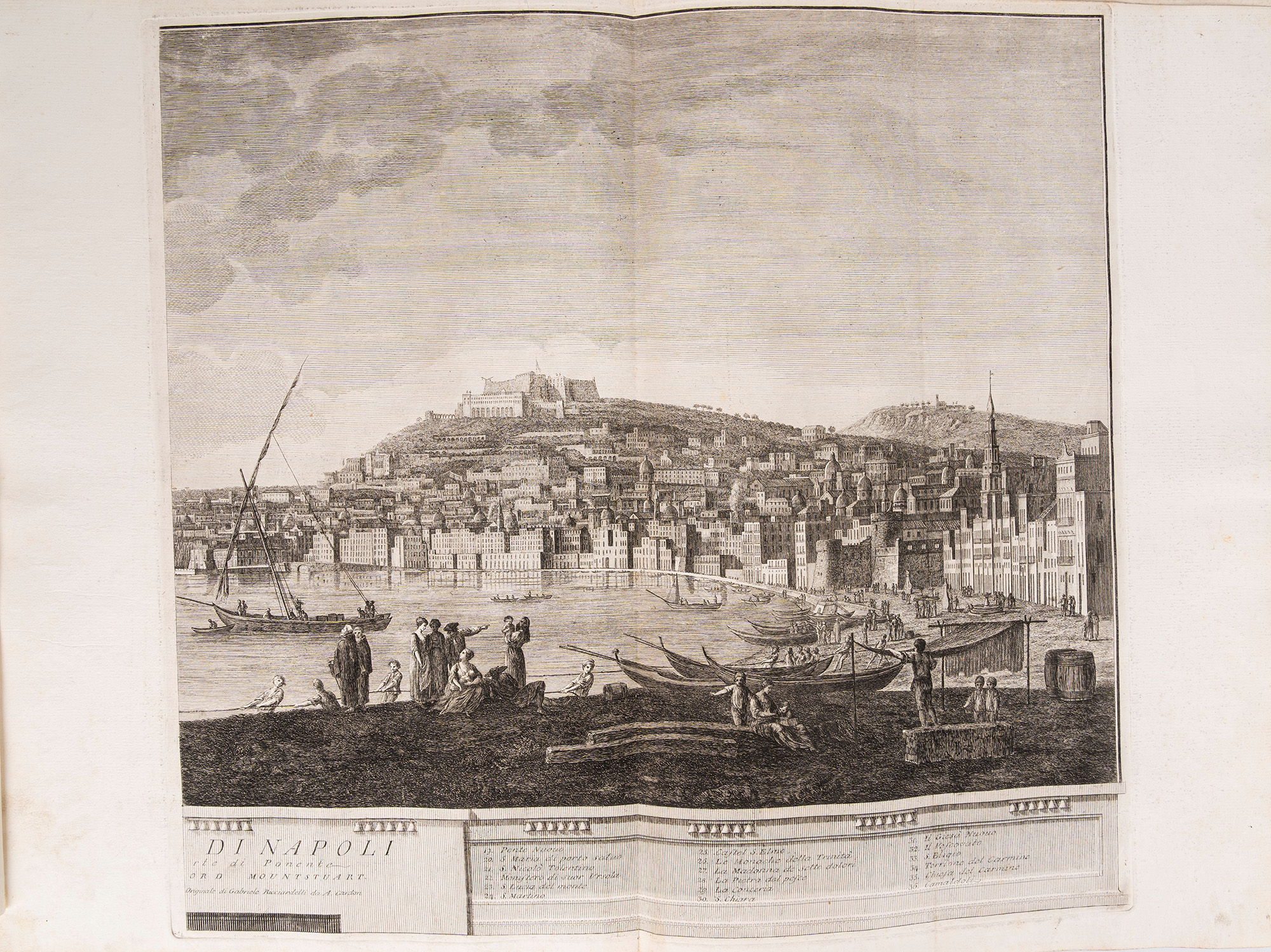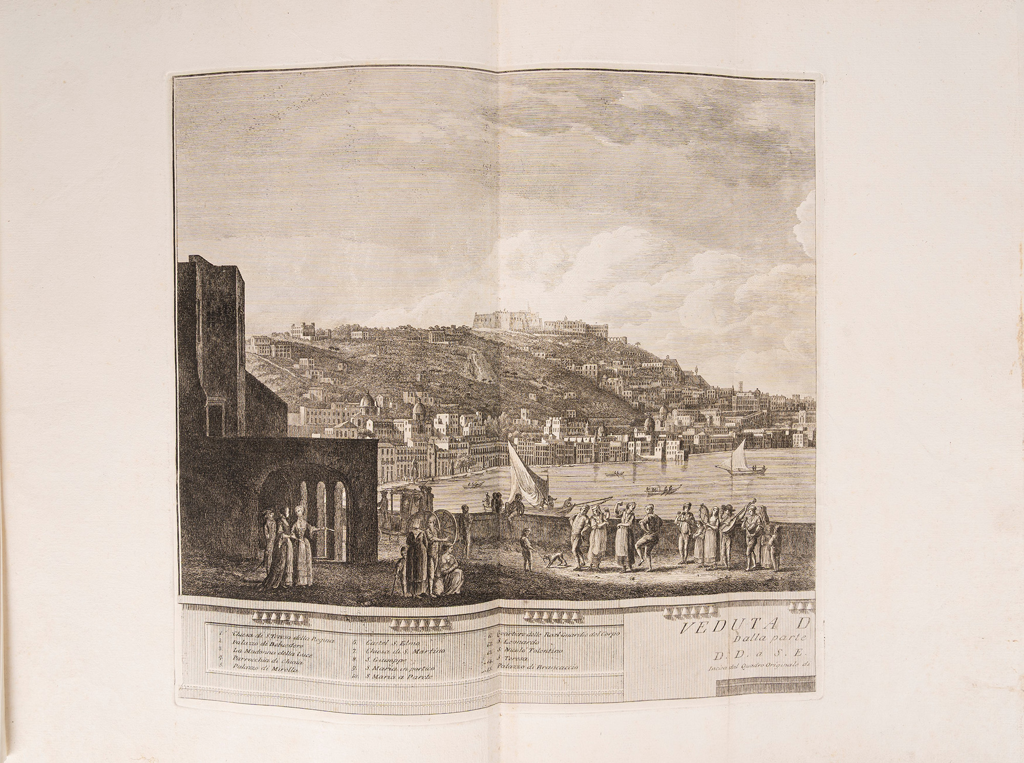 Napoli, 1765. Raccolta di incisioni su rame composta come segue: 6 tavole su doppia pagina che raffigurano il Golfo di Napoli e i Campi Flegrei, 8 tavole su doppia pagina che compongono 4 vedute cm 44x43(x2); 42x43(x2); 52x43(x2); 52x43(x2) intitolate "Veduta di Chiaia da Levante","Veduta di Ponte Novo", "Veduta di Chiaia da Ponente", "Veduta di Napoli", 15 tavole ciascuna composta da due incisioni per un totale di 30 vedute, tutte protette da velina, qualche piccola macchia marginale alle ultime carte, legatura coeva in mezza pelle e carta d'epoca, incisione del titolo in oro entro tassello al dorso, spellature ai piatti e alcuni difetti al dorso, custodia di epoca successiva in tela marrone. Ex libris cartacei al contropiatto.