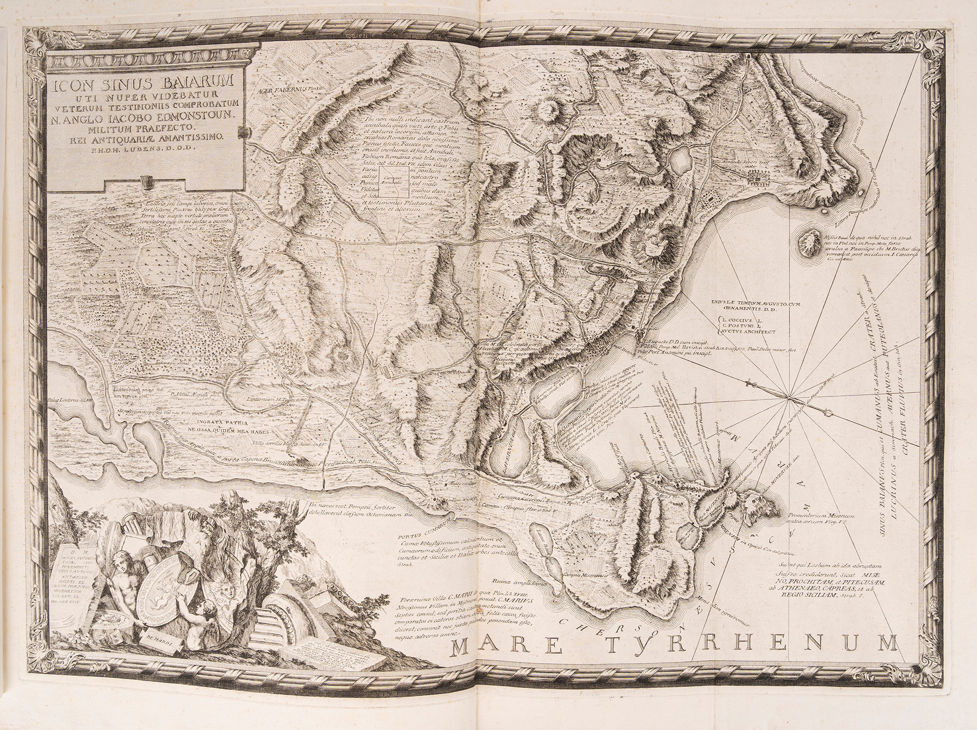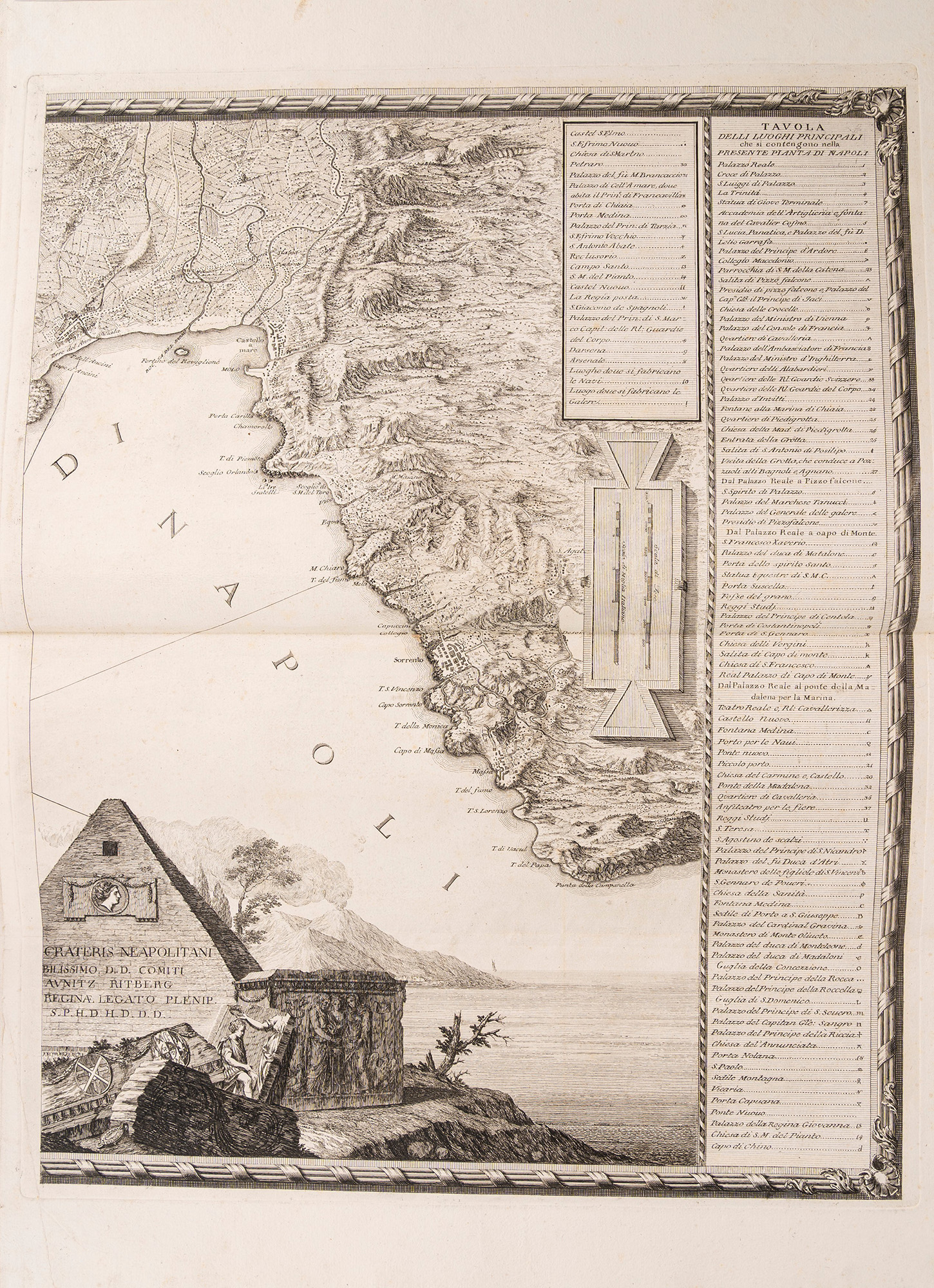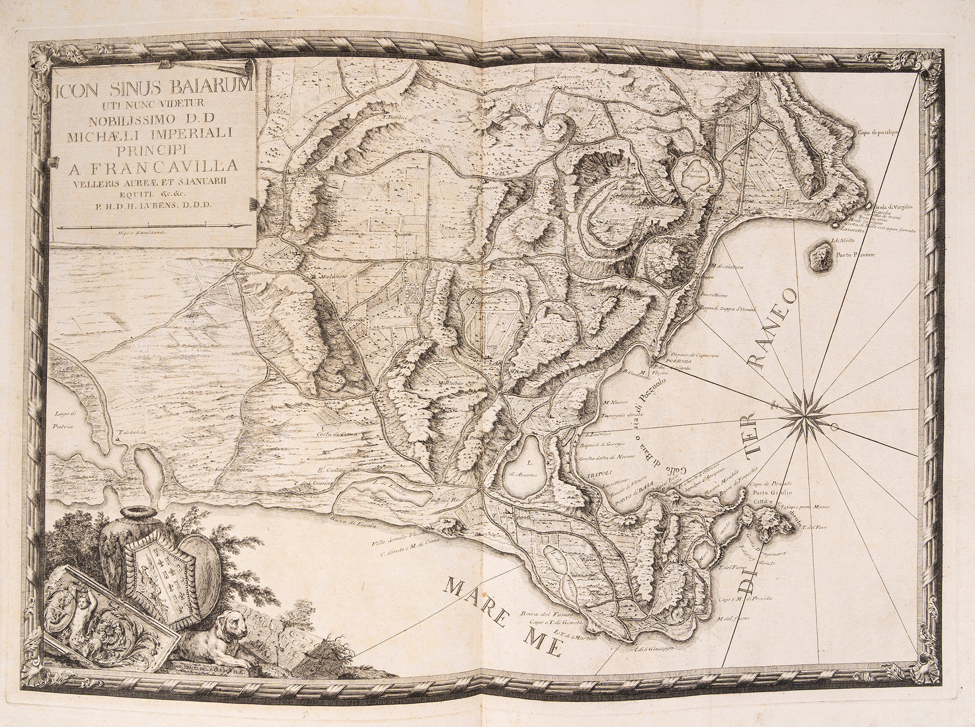 Napoli, 1765. Raccolta di incisioni su rame composta come segue: 6 tavole su doppia pagina che raffigurano il Golfo di Napoli e i Campi Flegrei, 8 tavole su doppia pagina che compongono 4 vedute cm 44x43(x2); 42x43(x2); 52x43(x2); 52x43(x2) intitolate "Veduta di Chiaia da Levante","Veduta di Ponte Novo", "Veduta di Chiaia da Ponente", "Veduta di Napoli", 15 tavole ciascuna composta da due incisioni per un totale di 30 vedute, tutte protette da velina, qualche piccola macchia marginale alle ultime carte, legatura coeva in mezza pelle e carta d'epoca, incisione del titolo in oro entro tassello al dorso, spellature ai piatti e alcuni difetti al dorso, custodia di epoca successiva in tela marrone. Ex libris cartacei al contropiatto.