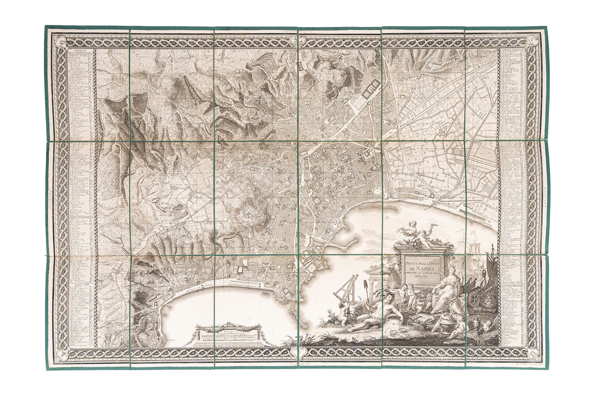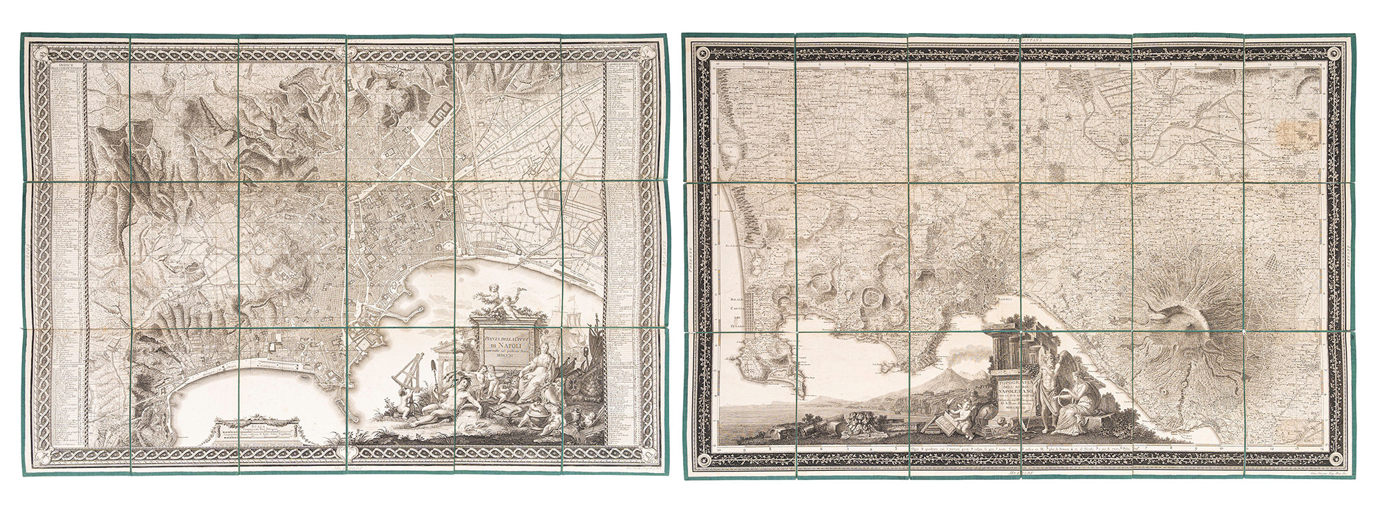 Napoli, G. Guerra, 1790. Insieme: Topografia dell'Agro Napoletano con le sue Adjacenze [Napoli, G. Guerra, 1792]. Entrambe le carte intelate, tassello in marocchino rosso con la scritta in oro "Zannoni / Agro/ Napoletano / 1793" e l'altro "Zannoni/ pianta di/ Napoli".