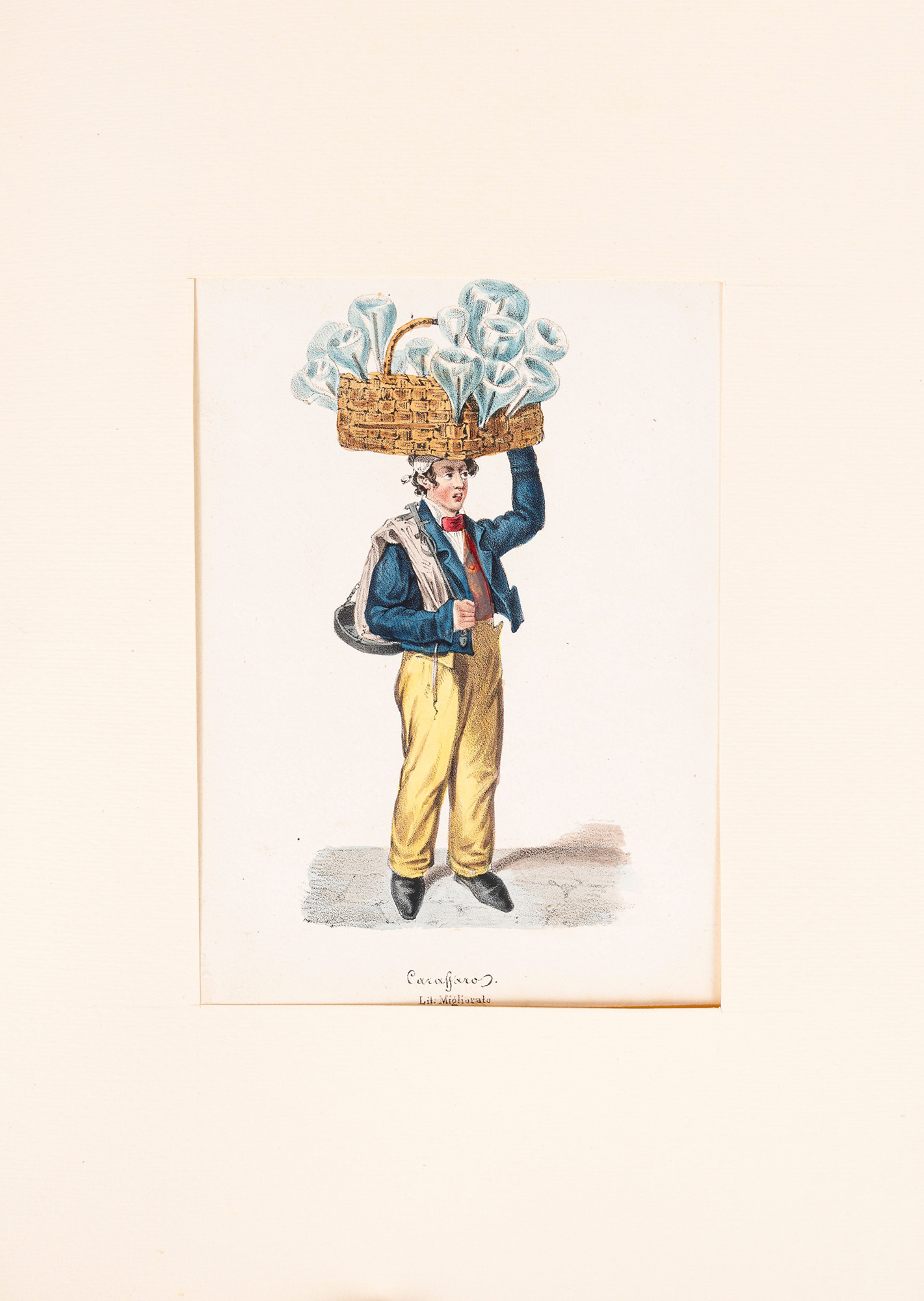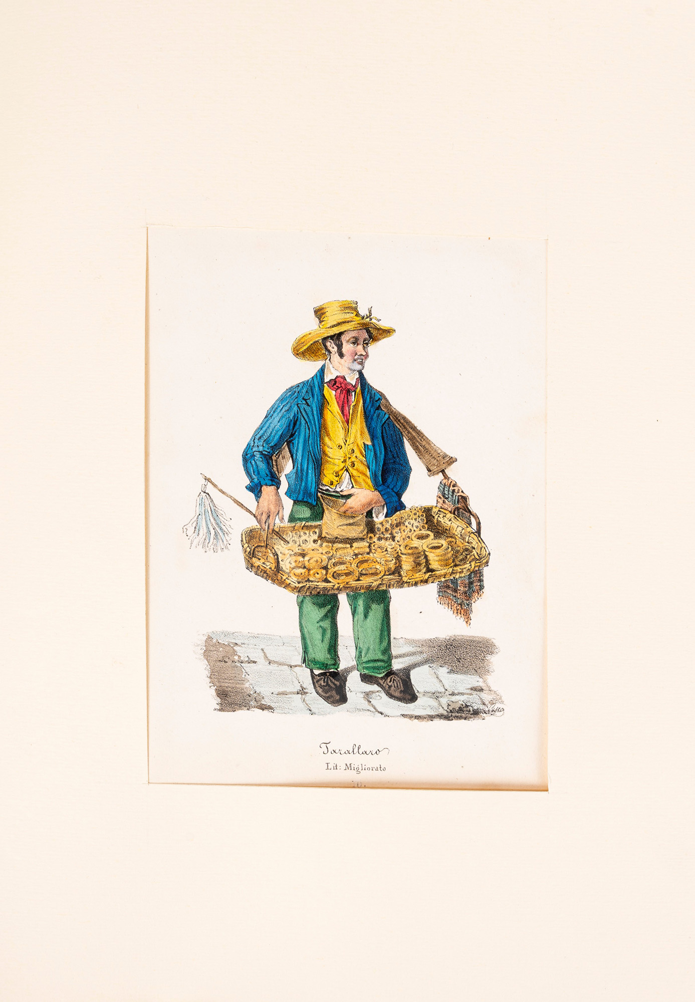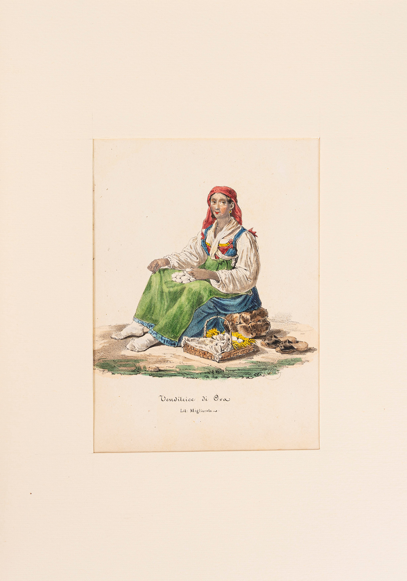 [Napoli, Litografia Migliorato, c.ca 1840/50]. In 4°. Raccolta di 20 litografie acquarellate a mano coevamente ciascuna cm 16,5 x 12,5 posta entro passepartout, poche tavole con lievi bruniture e fioriture, pregiata legatura moderna d'amatore in pieno marocchino rosso, eleganti incisioni in oro ai piatti, titolo e fregi al dorso.