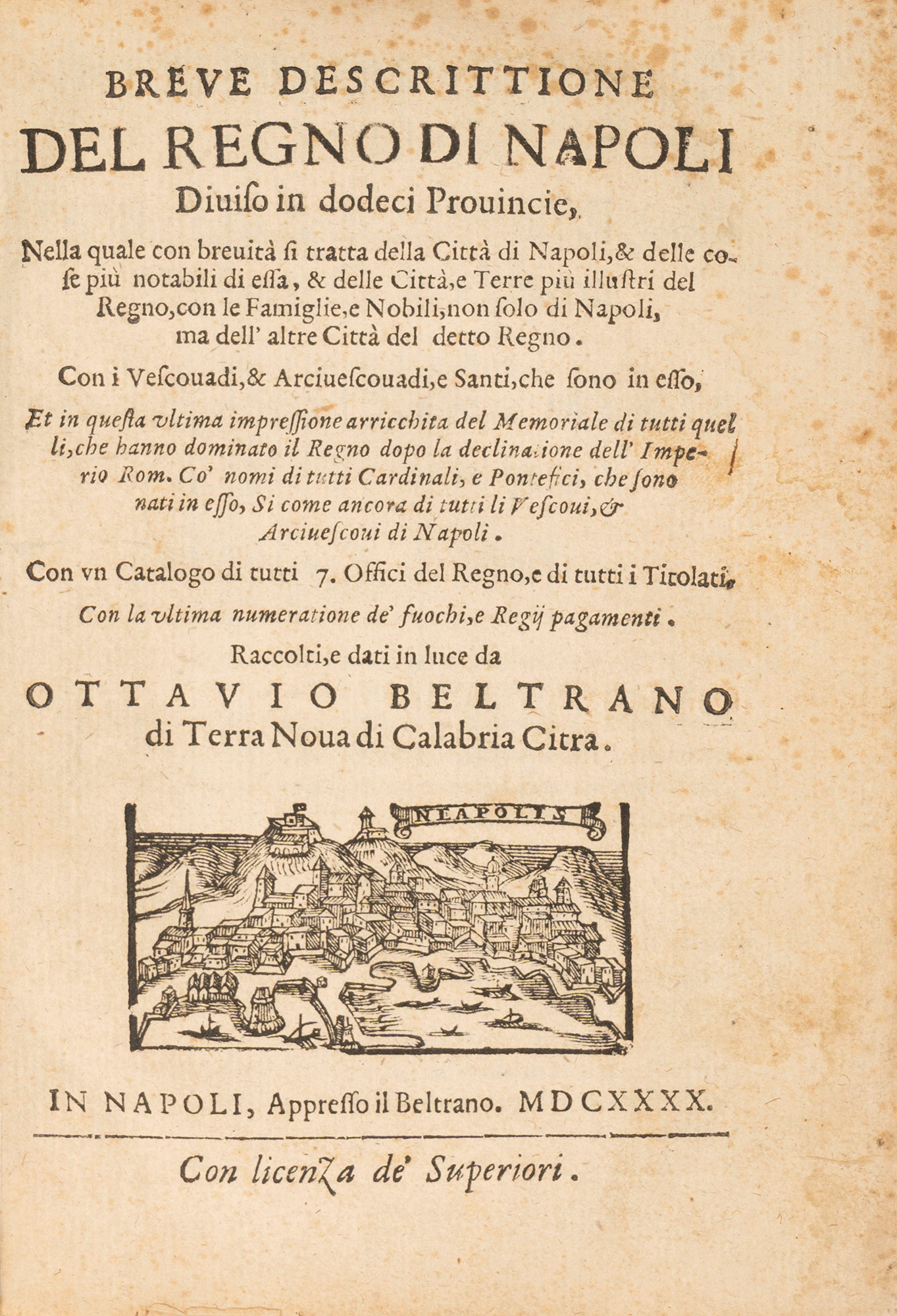 Napoli, Beltrano, 1640. In quarto. Al Frontespizio vignetta incisa in rame, illustrata in rame con numerosi stemmi di nobili famiglie incise in rame, bruniture , manca la prima carta a piena pagina, in fine volume mancanti 2 carte, un foglio non antico inserito in fine, brunitura e qualche macchia, legatura moderna in pergamena al dorso tassello in con titolo in oro