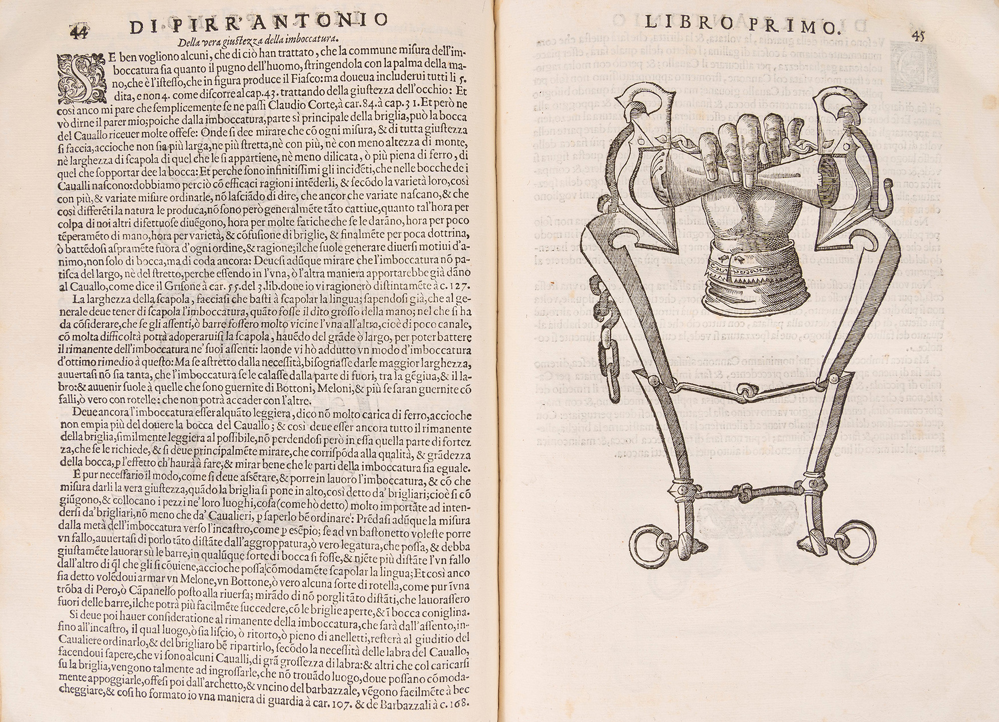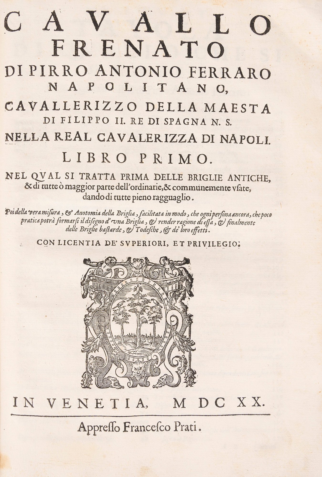 Venezia, Francesco Prati, 1620. In 2°. 2 parti in 1 tomo. Marca tipografica incisa in legno ai frontespizi, frontespizio della prima parte in rosso e nero, 55 illustrazioni xilografiche nel testo e 87 a piena pagina che rappresentano cavalli, morsi e briglie, qualche rara fioritura, legatura coeva floscia in piena pergamena con titolo manoscritto al dorso liscio, piccola mancanza al piatto posteriore, segni del tempo. Ex libris cartaceo al contropiatto. Astuccio in tela.