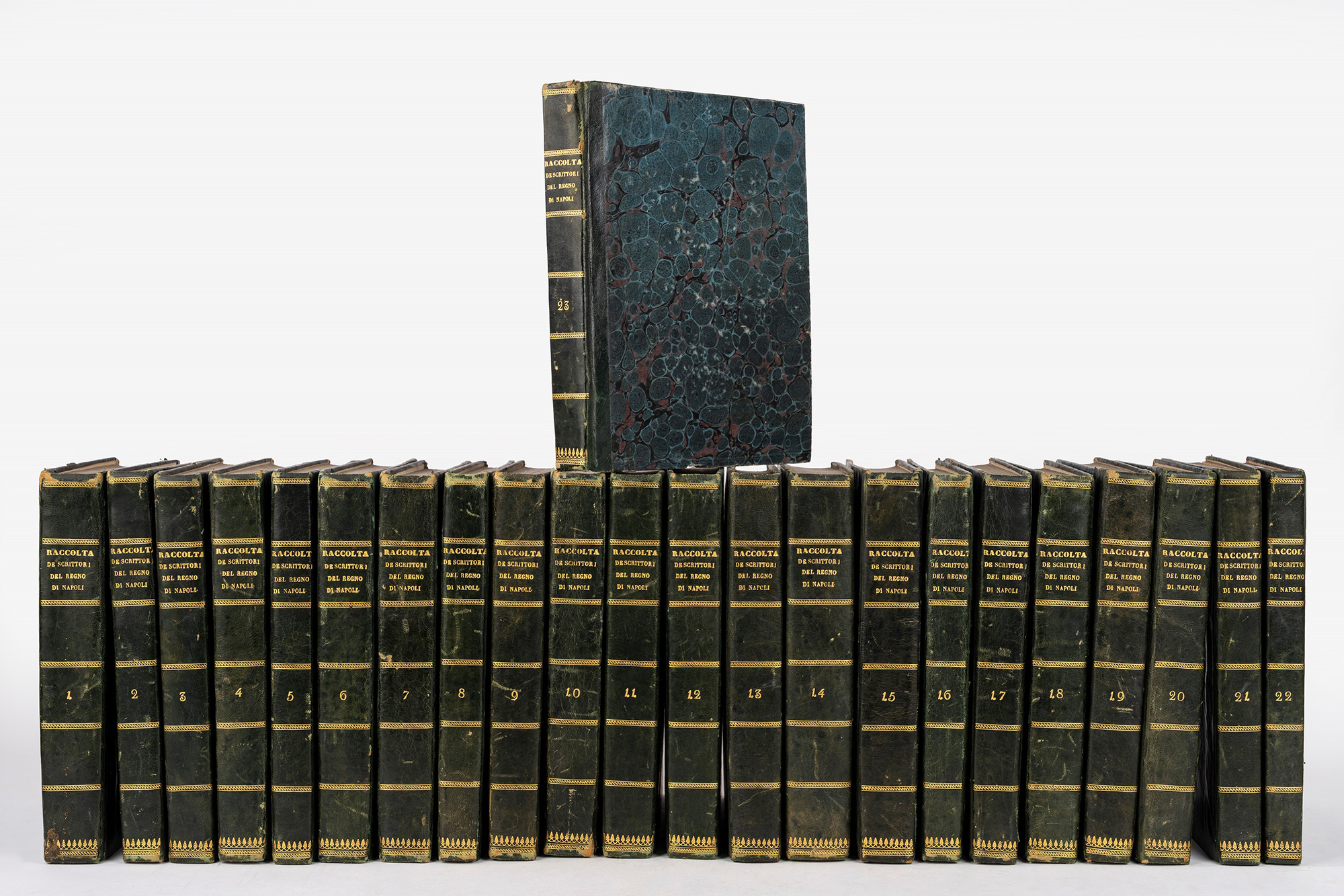 Napoli, Giovanni Gravier, 1769-1772. In 4°. 23 volumi numerati da 1 a 23. Fregio al frontespizio, numerose illustrazioni nel testo, con una grande tav. della città di Capua al vol. 21, lievi fioriture e arrossature, legature coeve in mezzo marocchino e carta marmorizzata, titoli in oro al dorso liscio, tagli a spruzzo, qualche lieve difetto.