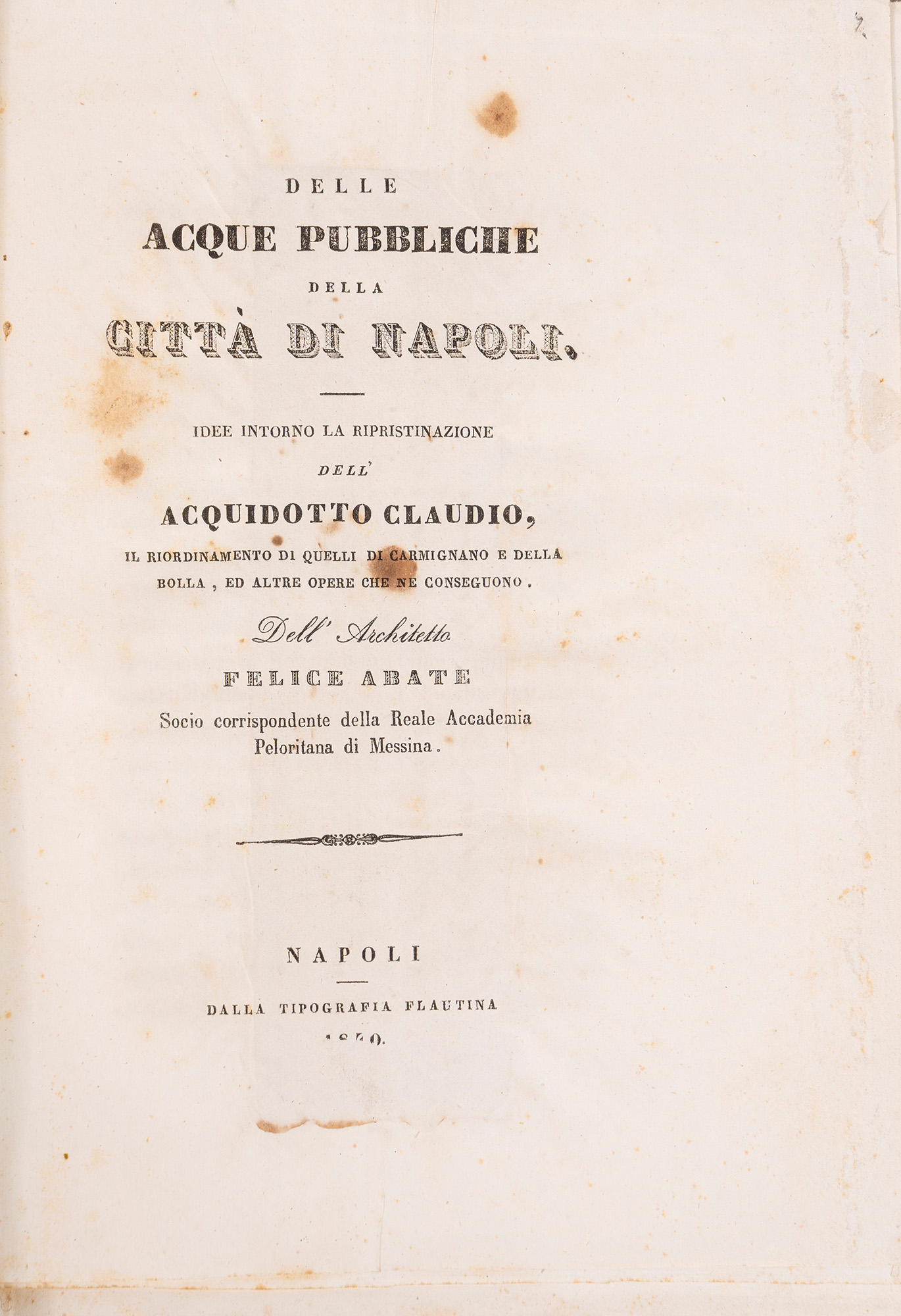 Napoli, Tipografia Plautina, 1840. In 4°. Esemplare in barbe, conservato in un cartoncino celeste con all'interno invio autografo dell'autore a Giacomo Paci. Insieme nel lotto, Delle antiche consuetudini e leggi marittime delle Province napolitane, Napoli, Fratelli de' Angelis, 1871. Legatura in mezza pelle marrone e tela verde.