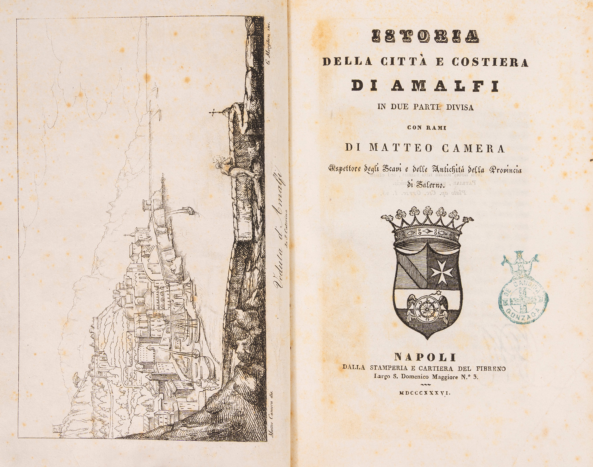 Napoli, Stamperia del Fibreno. 1836. In 8°. Bella veduta di Amalfi in antiporta incisa da G. Morghen, stemma di Amalfi al frontespizio, con XI tavole e una carta topografica ripiegata in fine al volume (staccata), lievi fioriture, qualche leggera arrossatura, legatura coeva in mezza pelle, titolo in oro al dorso, lievi difetti.