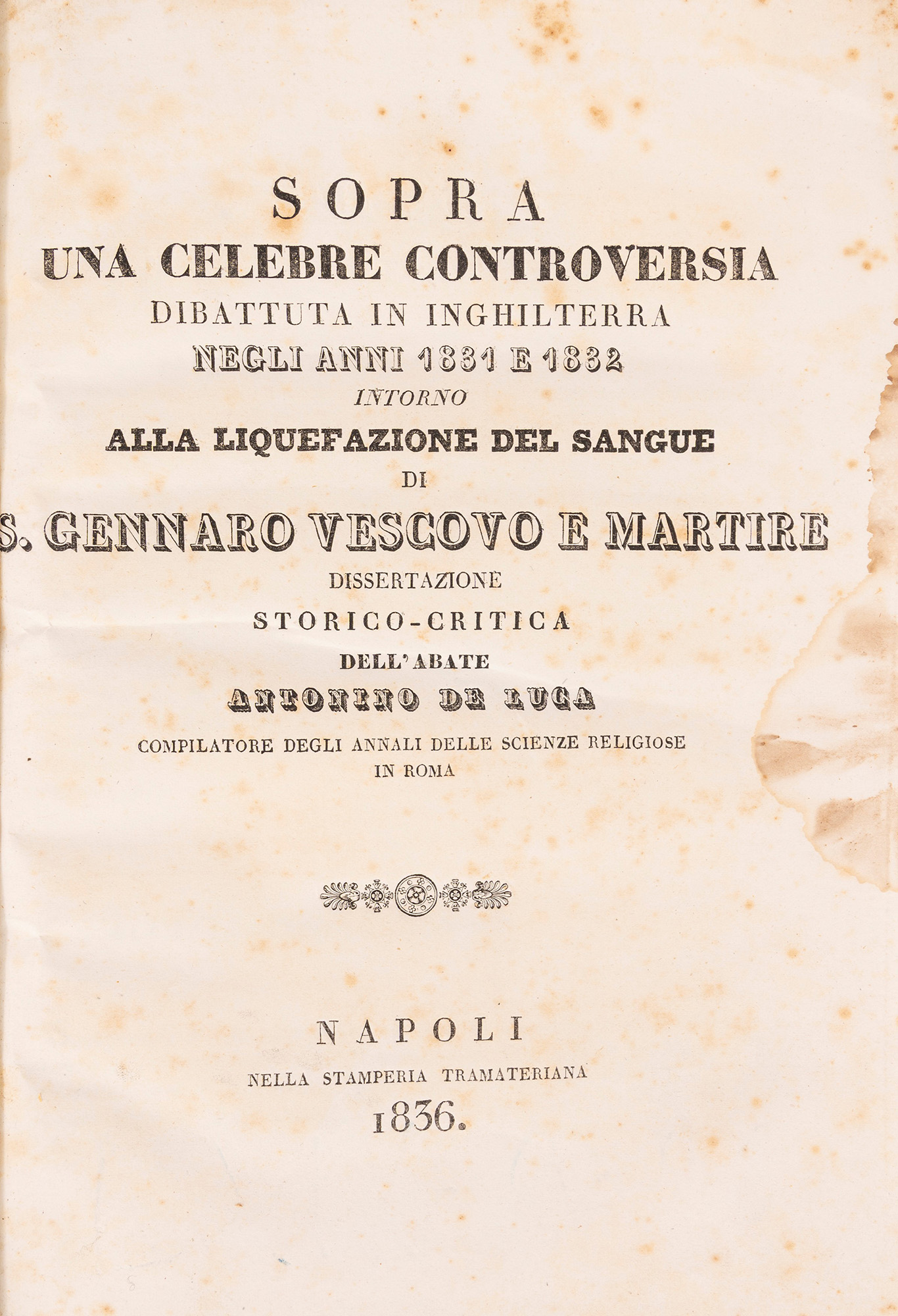 Napoli, Stamperia Tramateriana, 1836. In 2°. Fioriture e aloni, legatura moderna in mezza tela beige e cartone. § Camillo Tutini. Memorie della Vita Miracoli e Culto di S. Gennaro Martire. Napoli, a spese dell'editore, 1856. In 8°. Incisioni nel testo alle pp.51-52, fioriture, legatura coeva in mezza pelle marrone.