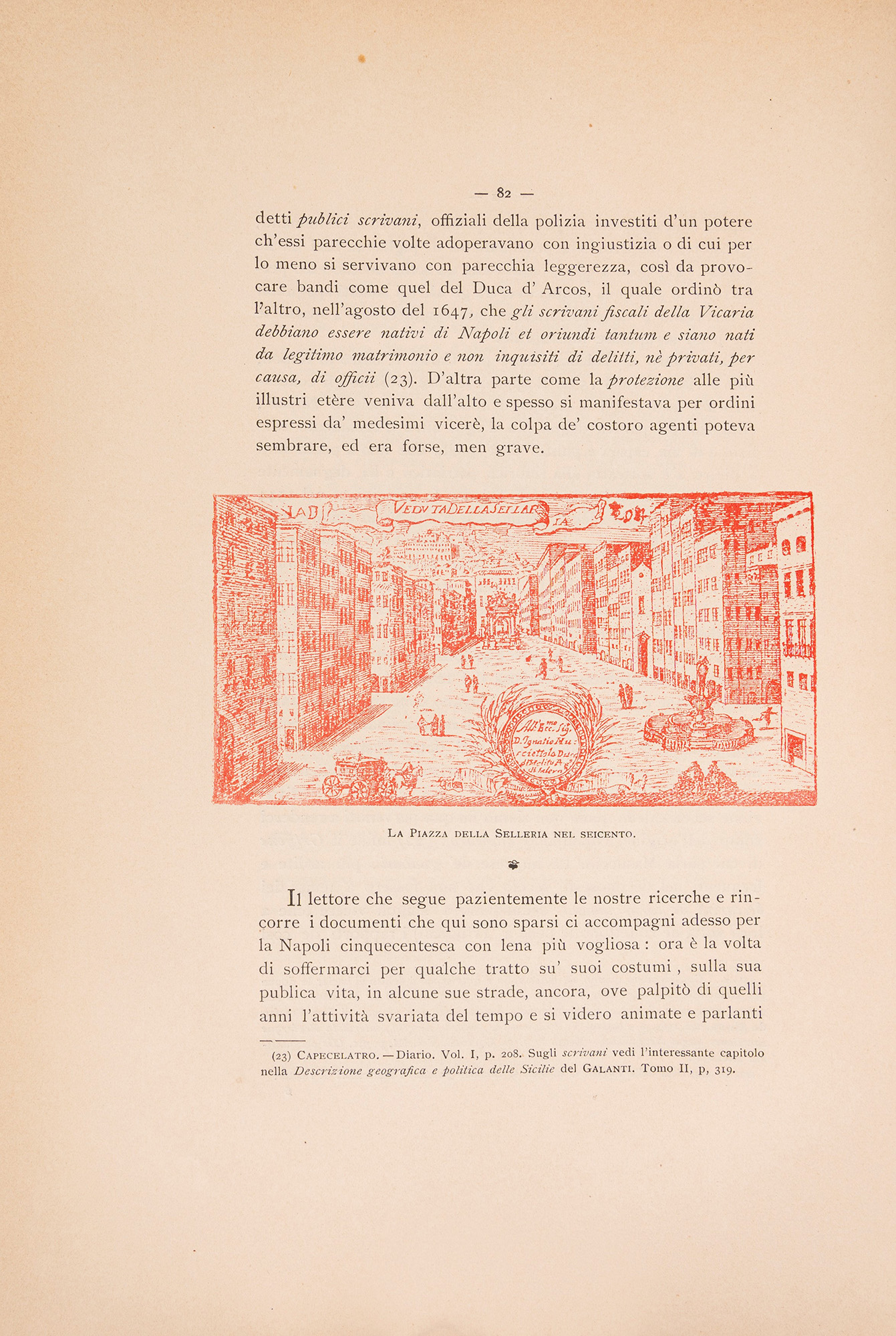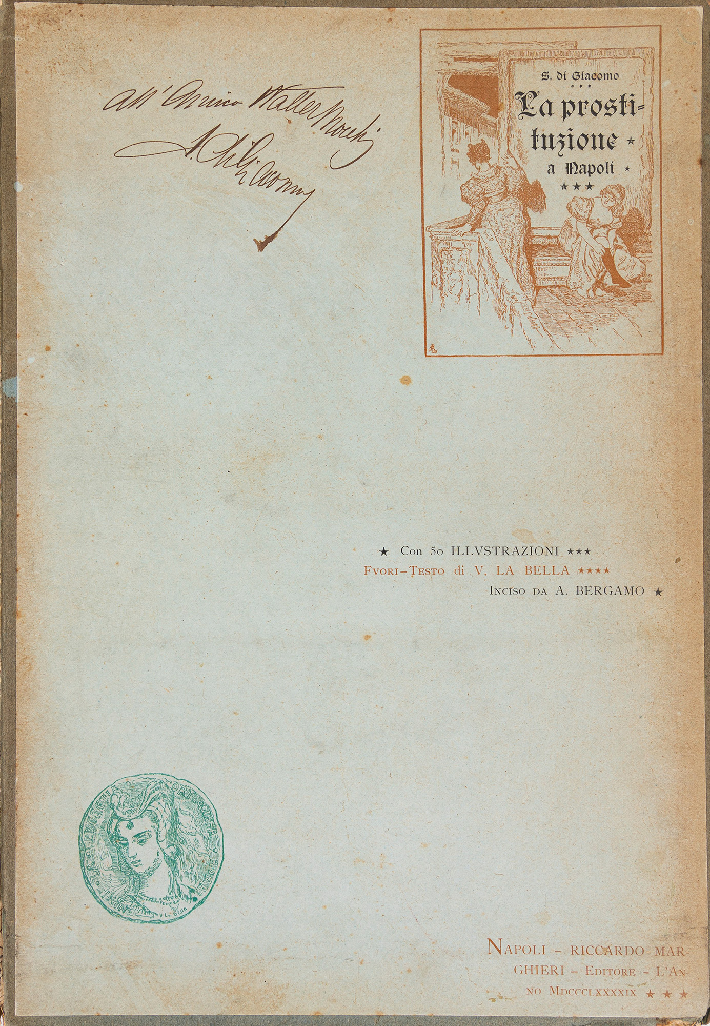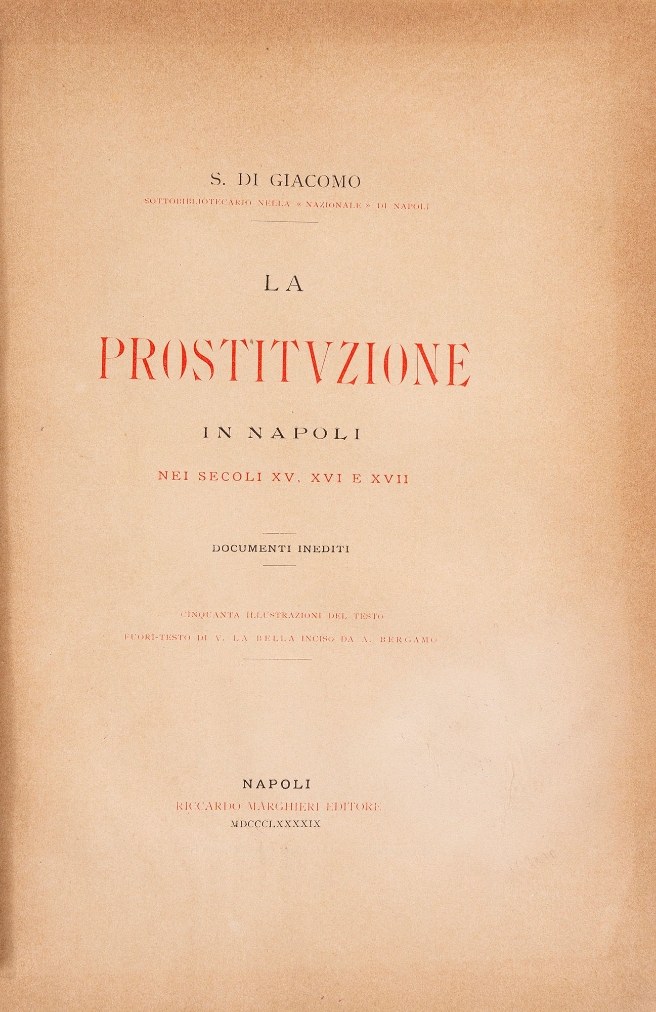 Napoli, Riccardo Marghieri Editore, 1899. In 8°. Con cinquanta illustrazioni in rosso e in nero, fra cui facsimili di antiche incisioni e documenti, oltre una tavola f.t. disegnata da V. La Bella ed incisa da A. Bergamo raffigurante la taverna del Crispano. Carta di guardia staccato dal dorso, frontespizio protetto da velina. sulla parte frontale della copertina. Legatura editoriale in cartone rigido, al piatto tiolo e illustrazione e dedica manoscritta, lievi difetti. Ex libris "S. di Giacomo".
