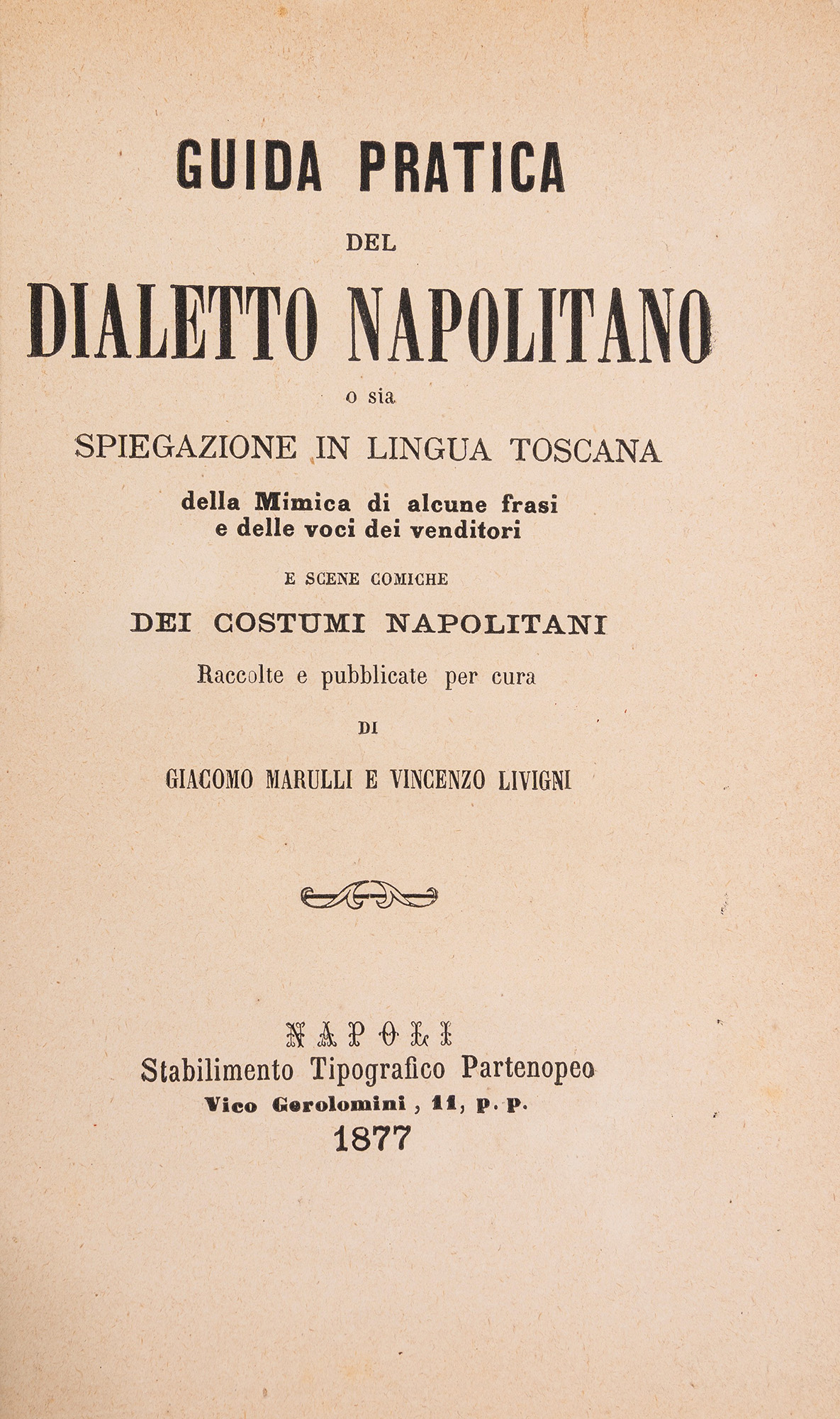 Napoli, Stabilimento tipografico partenopeo, 1877. In 8°. Brossura conservata entro legatura in mezzo marocchino verde con angoli e carta marmorizzata. § Insieme nel lotto Di Domenico, Ferdinando. Vocabolario napolitano italiano, Napoli, Mirelli, s.d. e Del dialetto napolitano programma seguito da critiche riflessioni, Napoli, Tipi della Minerva, 1836.