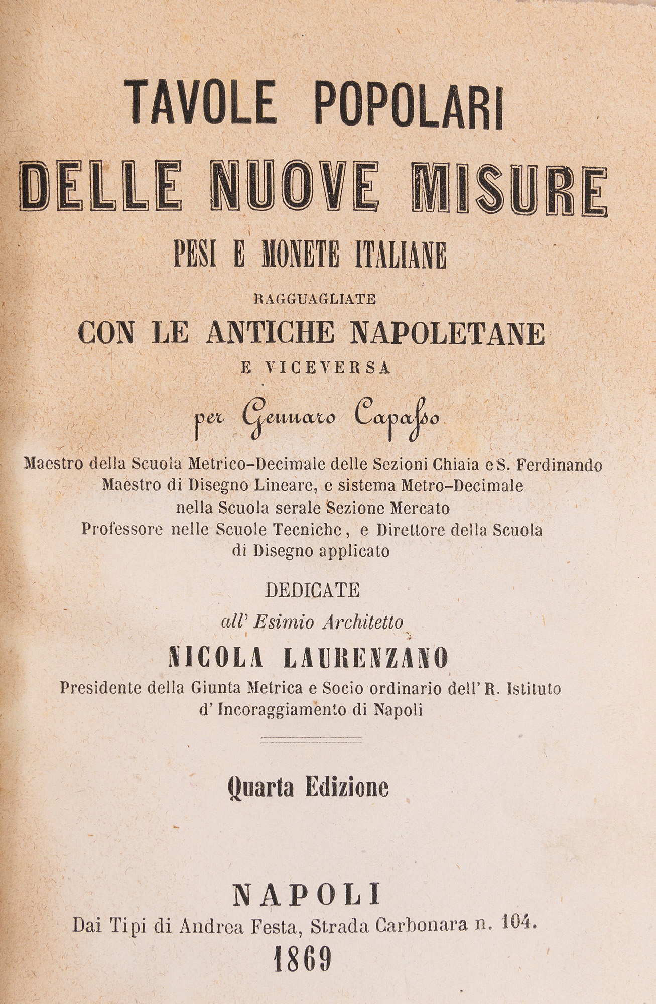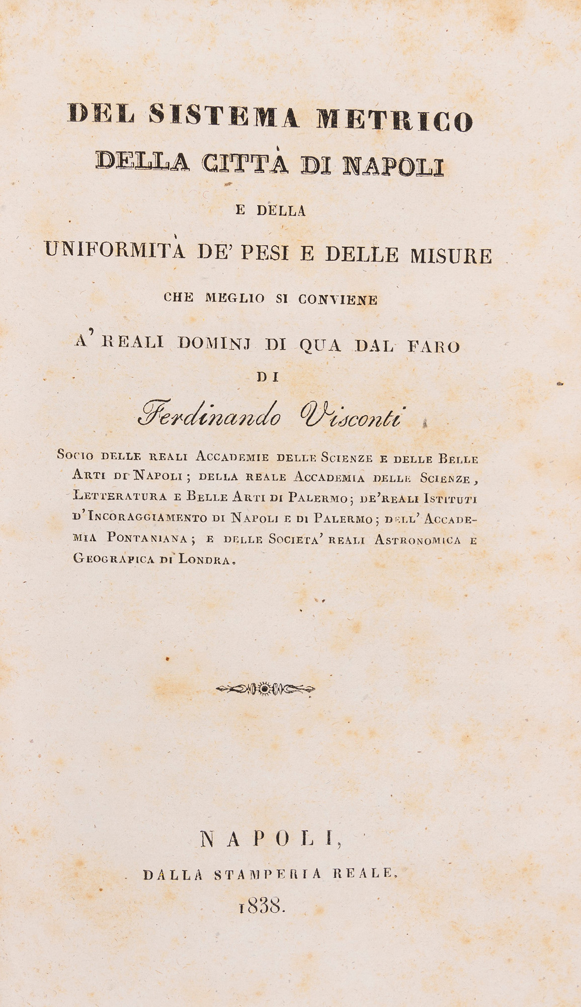 Napoli, Andrea Festa, 1869. In 12°. § Visconti, Ferdinando. Del sistema metrico della città di Napoli, Napoli, Stamperia Reale, 1838. § Bianchini, Lodovico. Principii del credito pubblico, Napoli, tip. nella Pietà de' Turchini, 1827.
