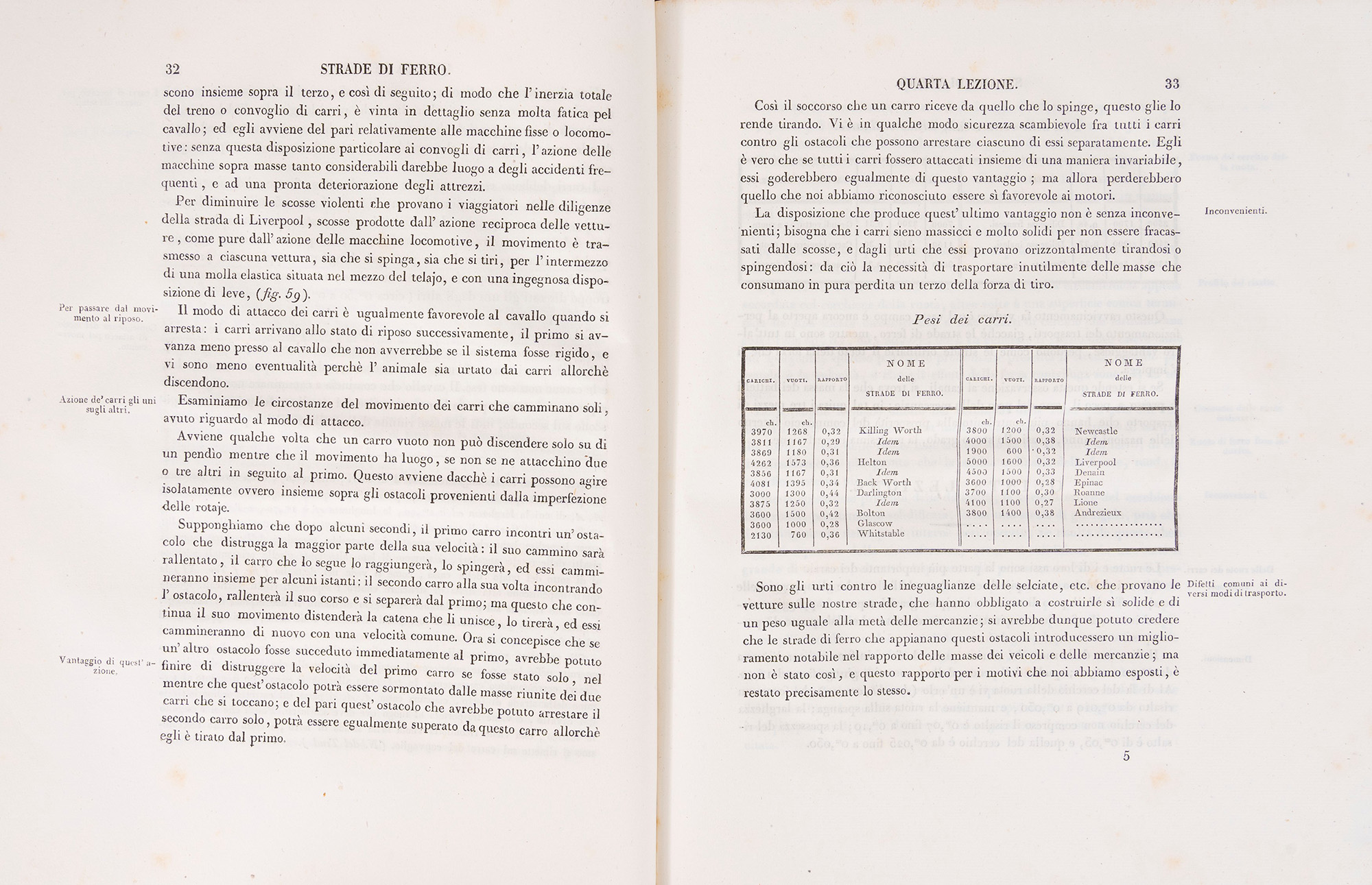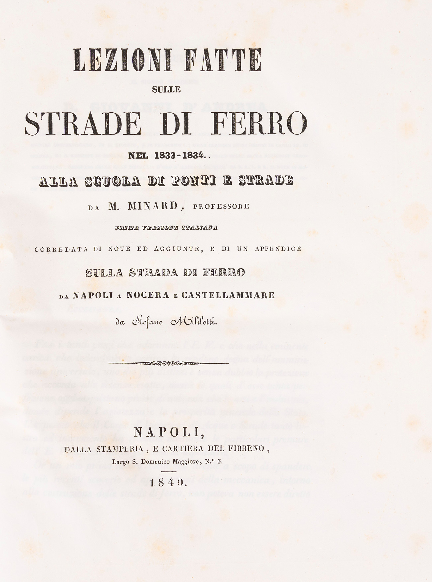 Napoli, Dalla stamperie, e cartiera del Fibreno, 1840. In 8°. Dedica manoscritta alla carta di guardia, titolo all'occhietto, strappo senza perdita a pag. 131. Legatura coeva in mezza pelle marrone con angoli, titolo al dorso e dettagli in oro. Opera corredata da: Mililotti S., Atlante di N°. 31 tavole dell'opera di M. Minard sulle strade di ferro, Napoli, Dalla stamperie, e cartiera del Fibreno, 1840. In 8°. Atlante con frontespizio proprio e 31 tavole. Legatura coeva in mezza pelle marrone con angoli, titolo al dorso e dettagli in oro. Prima edizione.