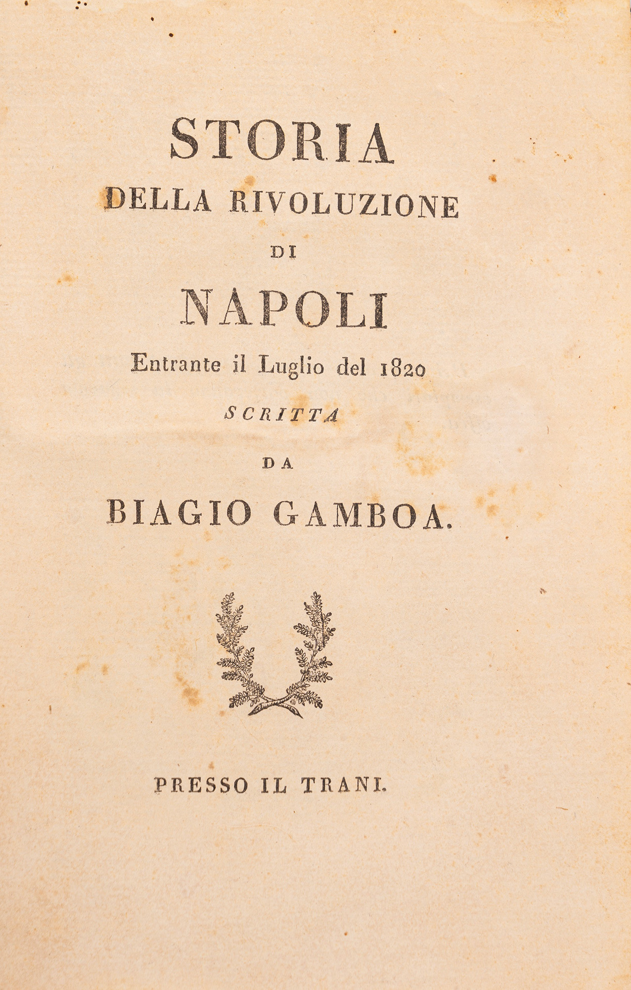 [Napoli], presso il Trani [1820?]. In 8°. Marginali fioriture, mezza pelle con decorazioni in oro e cartone marmorizzato. § Mariano D'Ayala. Memorie storico-militari dal 1734 al 1815. Napoli, Francesco Fernandes, 1835. In 8°. Fioriture, legatura in piena pergamena. § Ruoli de' Generali ed Uffiziali del Reale Esercito e dell'Armata di mare di Sua Maestà il Re del Regno delle Due Sicilie. Napoli, Tipografia Militare, 1860. In 8°. Testo impaginato in tabelle, fioriture, legatura in mezza pelle scura e cartone marmorizzato.