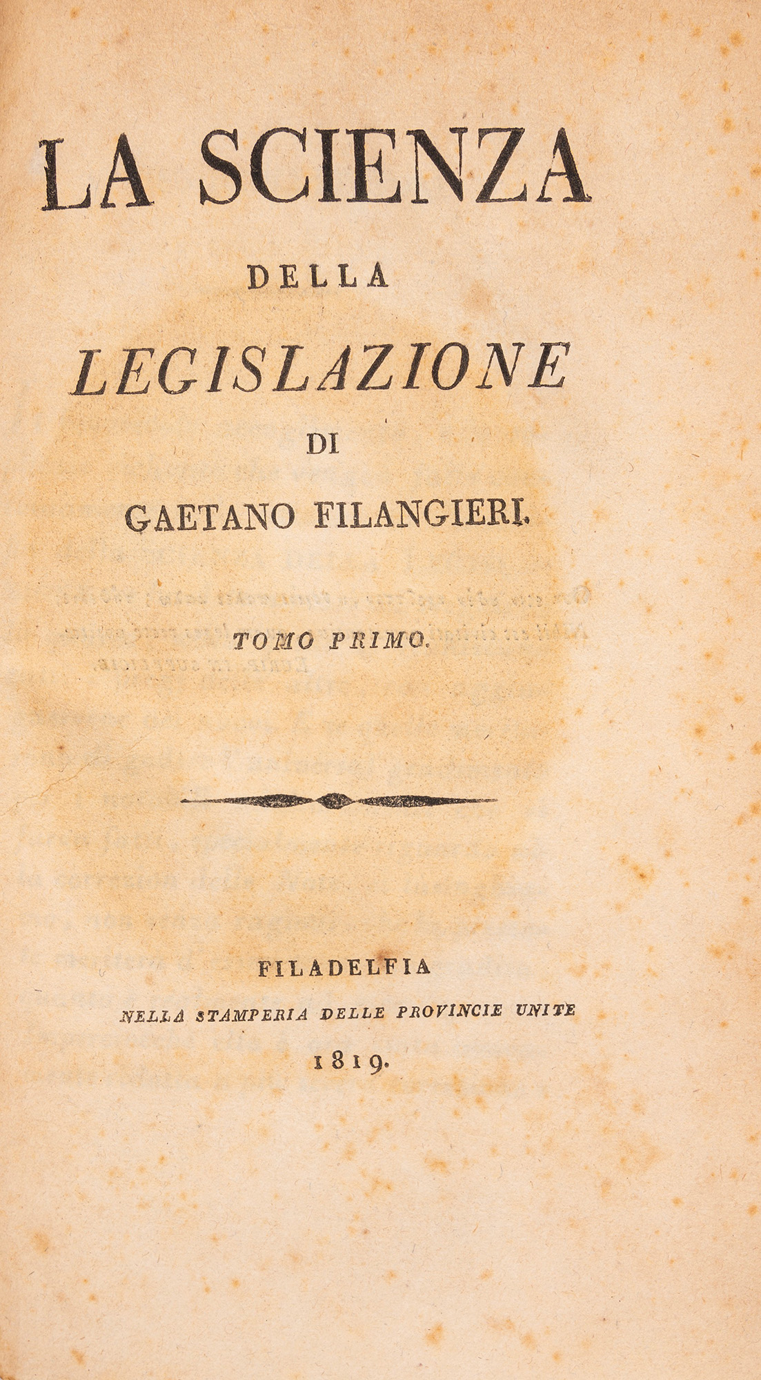 Filadelfia, Stamperia delle Provincie Unite, 1819. In 8°. 5 voll. Ritratto dell'Autore, esemplari in barbe, leggera brunitura, legatura in mezza pergamena e carta marmorizzata, titolo in nero al dorso. § Constant, B. Commentario alla scienza della legislazione di G. F. Filangieri, Italia, 1826