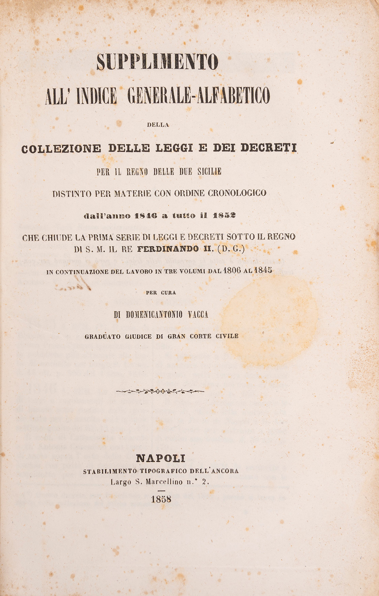 Napoli, Stamperia dell'Ancora, 1837-41. In 2°. 2 voll. Secondo volume intitolato Supplimento all'indice [...]. Lievi fioriture, legatura coeva in pergamena rigida, tasselli rosso e verdi al dorso. § Insieme nel lotto Supplimento alla collezione delle leggi. Napoli, Stamperia della segreteria di stato, 1818-1819. In 8°. 4 voll. (Vol. I parte I; Vol. I parte II; Vol. II parte I, Vol. II parte II). Fioriture, legature coeve in piena pergamena, titoli entro tasselli al dorso, tagli gialli. § Vacca, G. Supplimento all'indice generale-alfabetico della collezione delle leggi e dei decreti per il Regno delle Due Sicilie, Napoli, Stab. Tip. dell'Ancora, 1858. Rilegato in tela rossa, titolo in oro entro tassello al dorso.